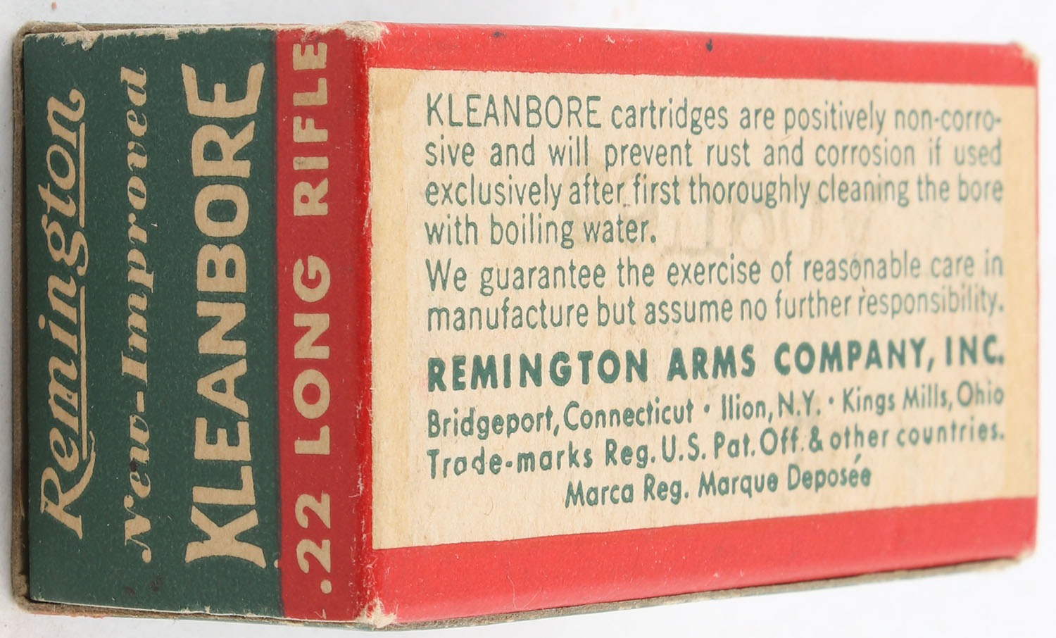 Remington, New and Improved Kleanbore, .22 Long Rifle, RHWeb: REM-11 LR-1, Full, 1pc. Green buff & red box, box is solid with excellent color, very minor corner wear, edges are crisp, end flaps are solid, ammo is excellent. Grade: Excellent + - Value: 8 to 12