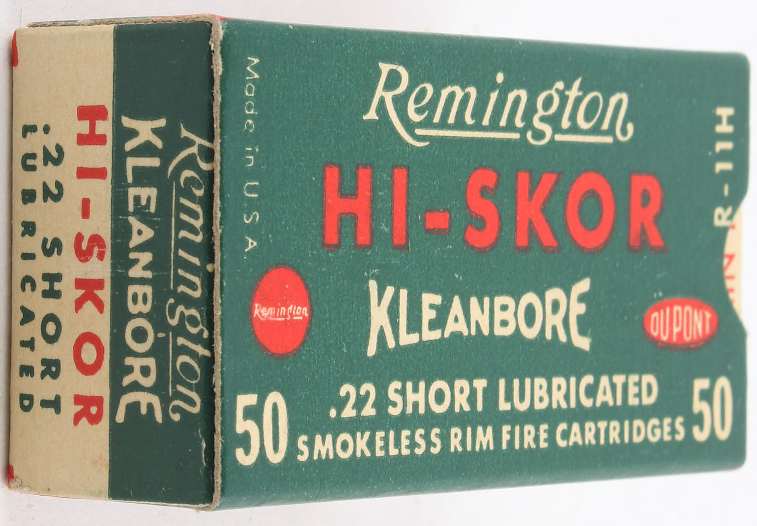 Remington, Hi-Skor, .22 Short, RHWeb: REM-53 S-1b, Full, 1pc. Green buff & red box, box is near mint with minty color, only very minor age soiling on bottom, corners are sharp, edges are crisp, end flaps are solid, ammo is excellent. Grade: Excellent ++ - Value: 30 to 45