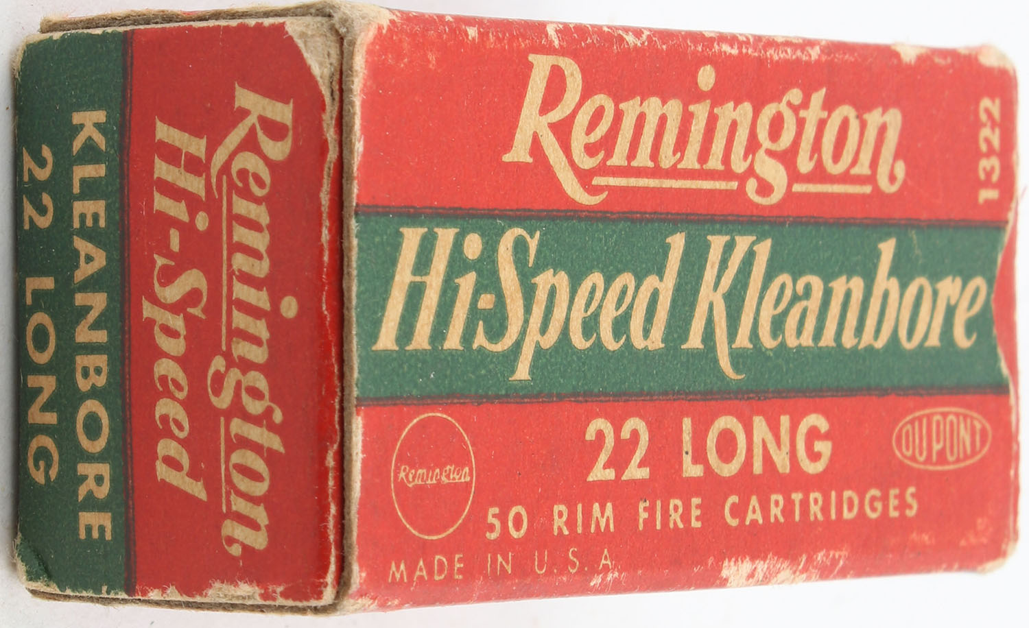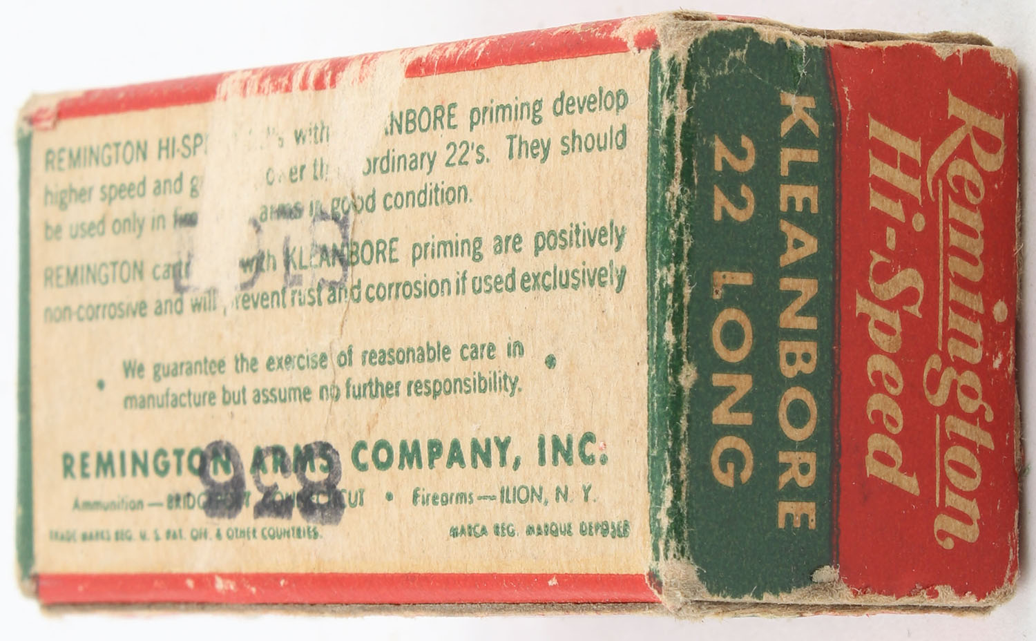 Remington, Hi-Speed Kleanbore, .22 Long, RHWeb: RHWeb: REM-14 L-1a, Full, 1pc. Red buff & green box, box is solid with very good color, minor age soiling, some edge & corner wear, end flaps are solid, ammo is excellent. Grade: Very Good + - Value: 4 to 10