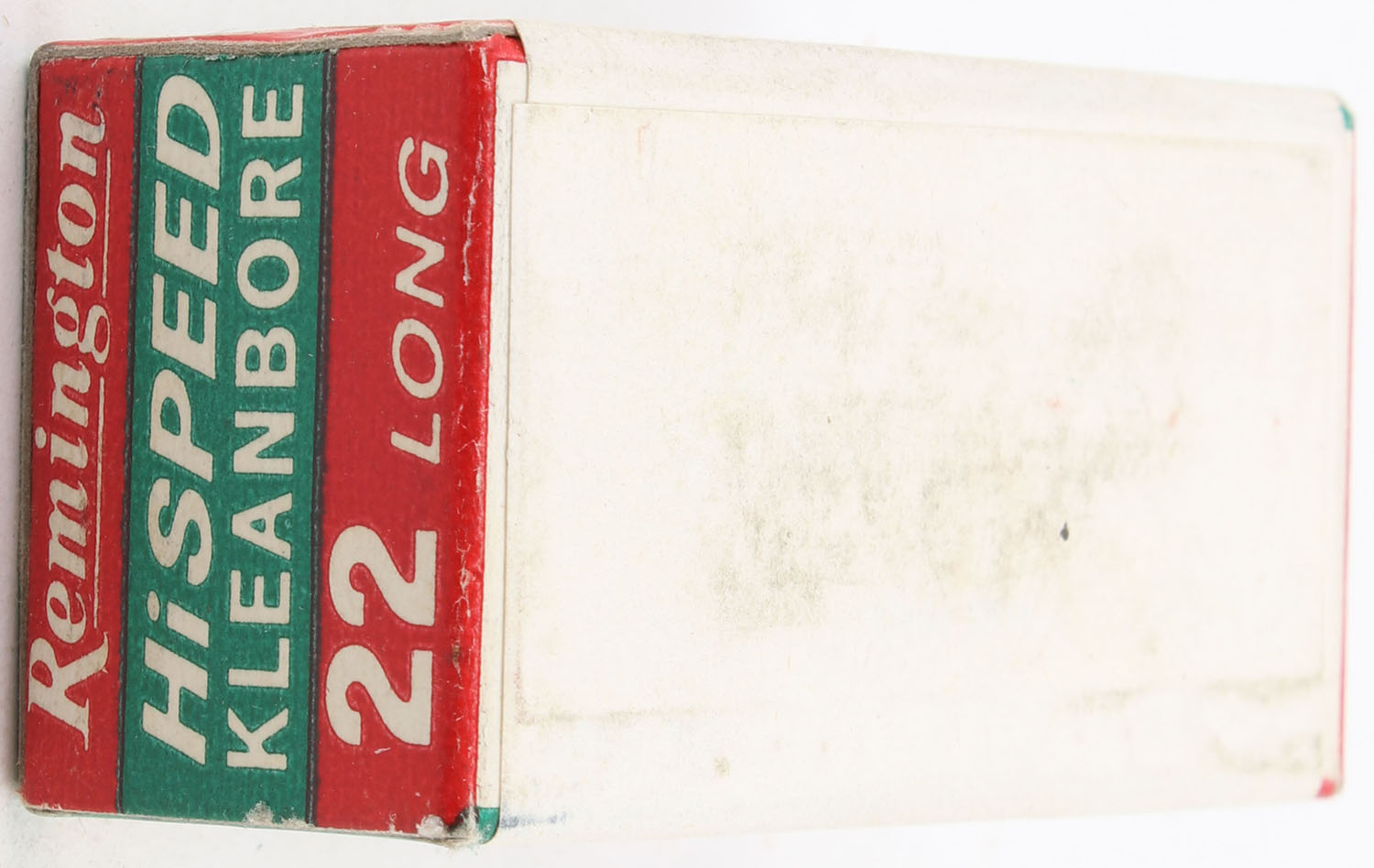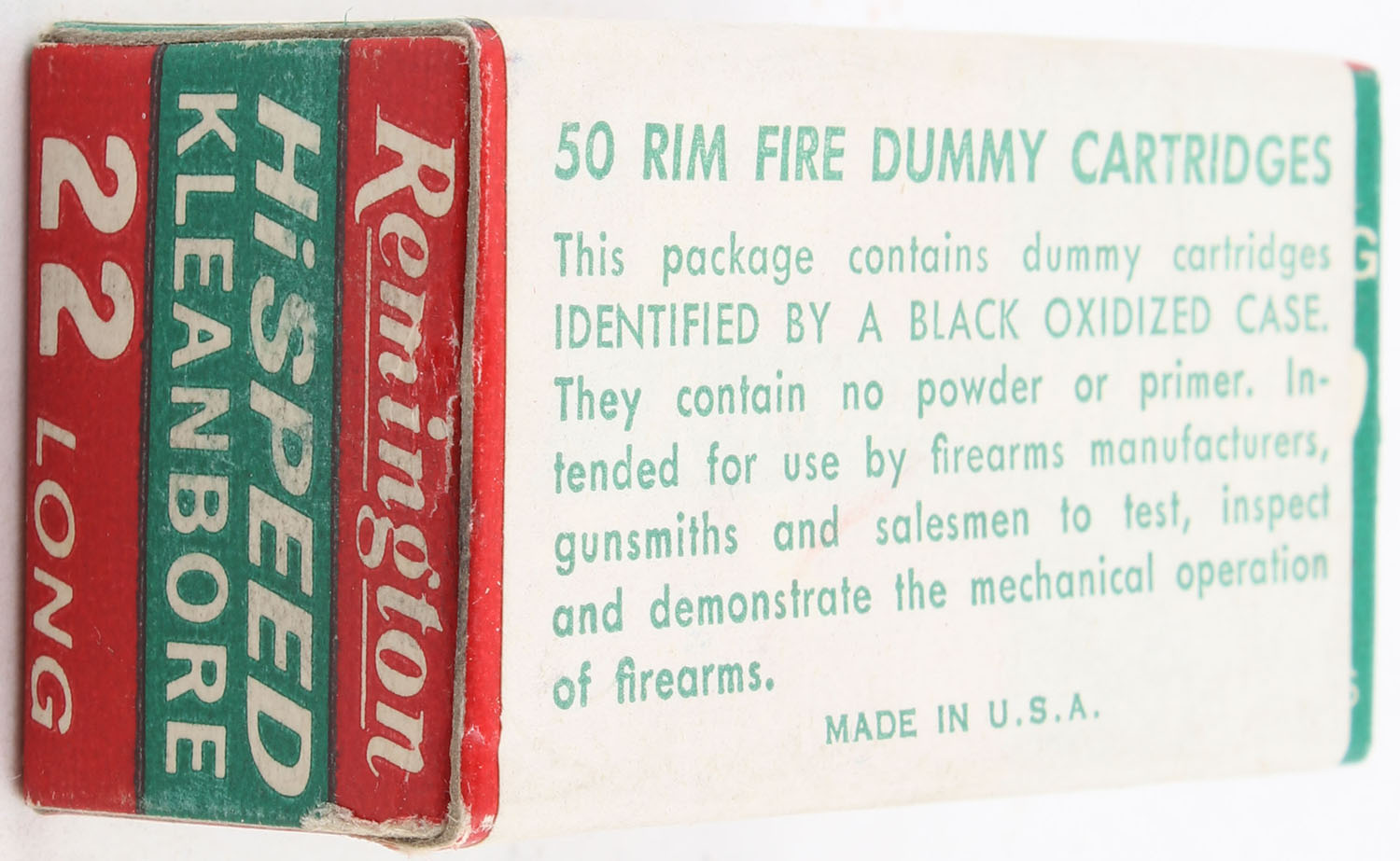 Remington, Hi-Speed Kleanbore, .22 Long Dummy Cartridges, RHWeb: REM-15 L-2, Full, 1pc. Red green & white box with white & green wraparound label, box is solid with excellent color, very minor color bleeding, corners are mostly sharp, edges are crisp, end flaps are solid, ammo is minty. Grade: Excellent + - Value: 10 to 15