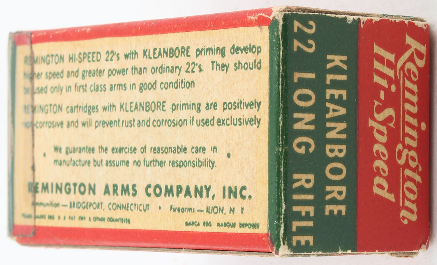 Remington, Hi-Speed Kleanbore, .22 Long Rifle, RHWeb: WRA-REM-14 LR-1e, Full, 1pc. Red green & buff box, box is solid with excellent color, very minor age soiling & edge wear, some corner wear, end flaps are solid, ammo is excellent to minty. Grade: Very Good ++ - Value: 2 to 10