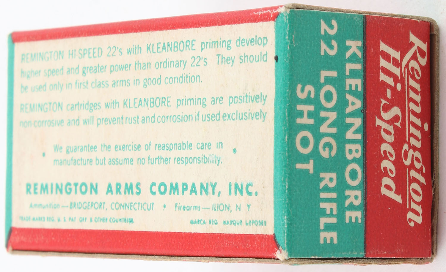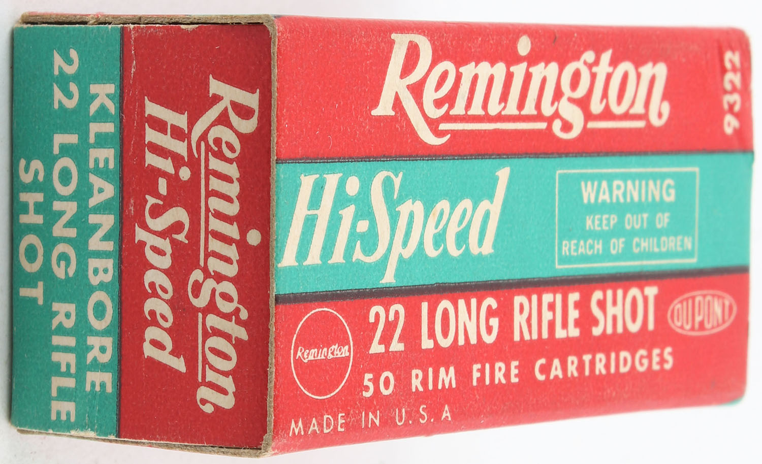 Remington, Hi-Speed, .22 Long Rifle Shot, RHWeb: REM-16 LR-4b, Full, 1pc. Red green & white box, box is near mint with minty color, only very minor corner wear, edges are crisp, end flaps are solid, ammo is minty. Grade: Excellent ++ - Value: 40 to 60