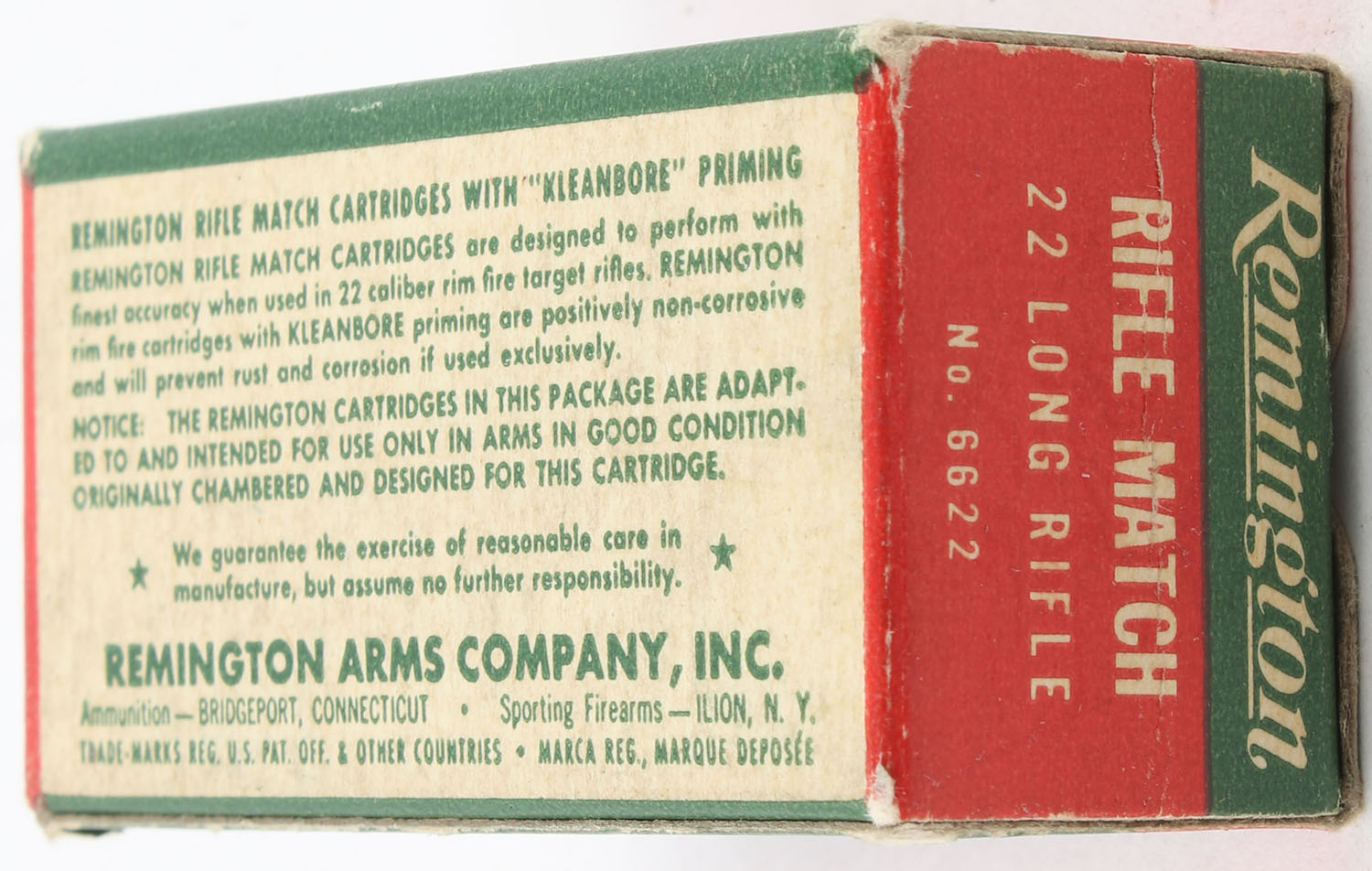 Remington, Rifle Match, .22 Long Rifle, For Use in Rifles Only, RHWeb: REM-54 LR-3a, Full, 1pc. Green red & white box, box is solid with excellent color, very minor edge & corner wear, end flaps are solid, ammo is excellent to minty. Grade: Excellent + - Value: 30 to 45