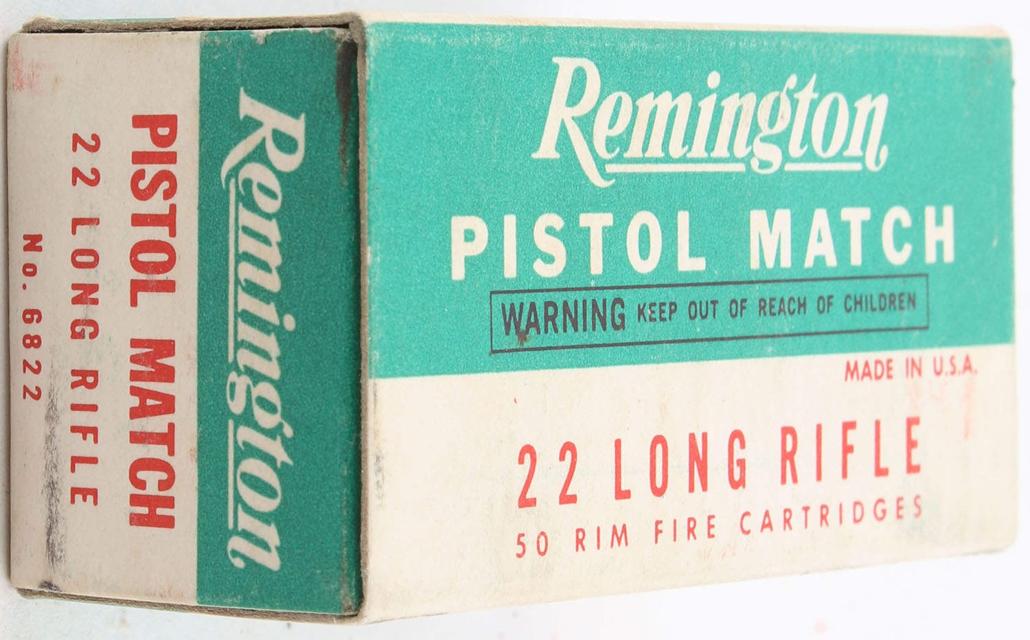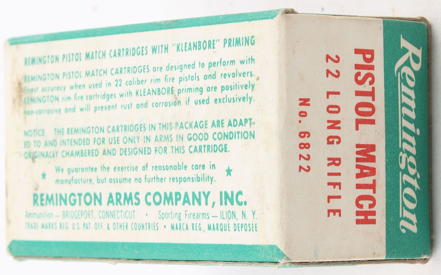 Remington, Pistol Match, .22 Long Rifle, RHWeb: REM-54 LR-7a, Partial 43rds., 1pc. Green white & red box, box is solid with excellent color, minor shelf wear, corners are mostly sharp, edges are crisp, end flaps are solid, ammo is minty. Grade: Excellent - Value: 6 to 10