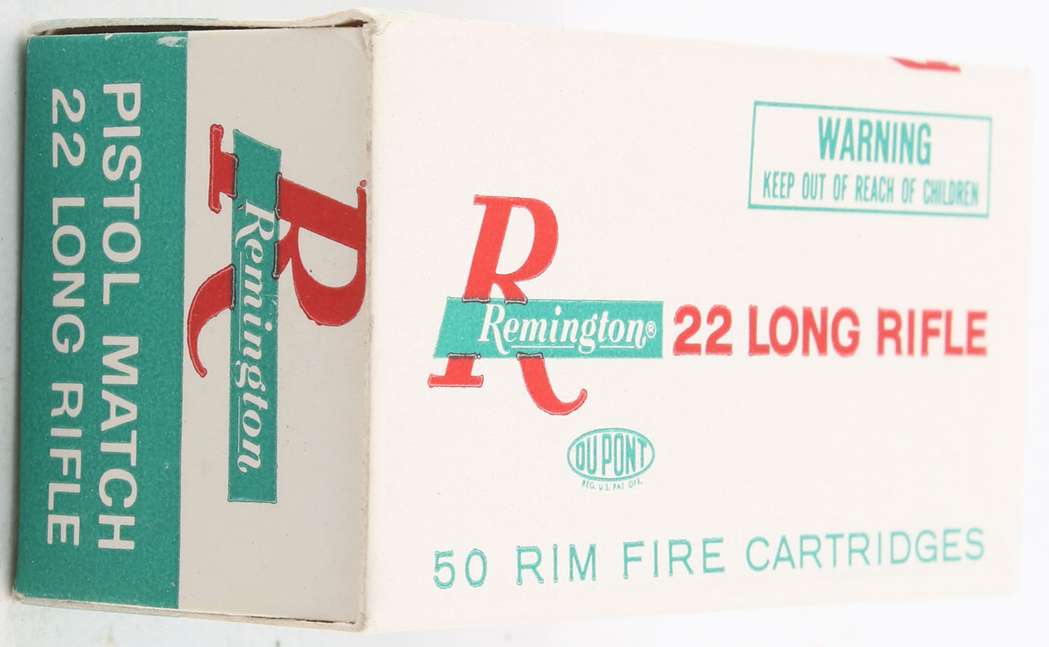 Remington, Pistol Match, .22 Long Rifle, RHWeb: REM-54 LR-11c, Full, 1pc. White green & red box, box is MINT with minty color, corners are sharp, edges are crisp, end flaps are solid, ammo is minty. Grade: MINT - Value: 6 to 10