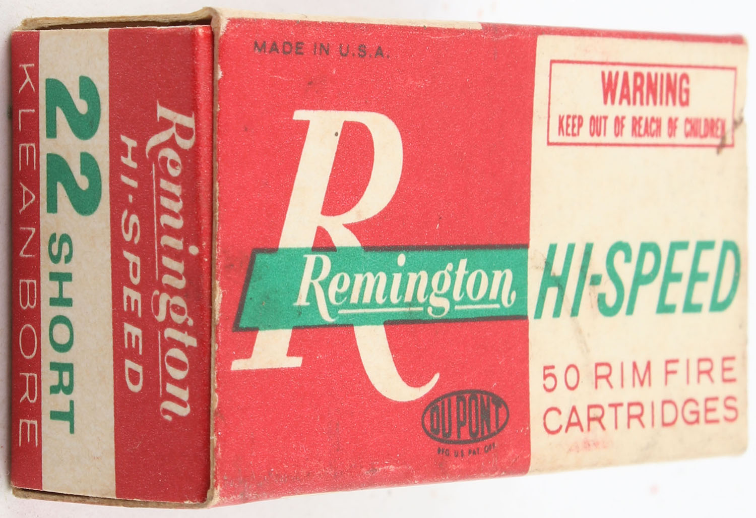 Remington, Hi-Speed, .22 Short, ''Golden'' Bullet, RHWeb: REM-17 S-2b, Full, 1pc. Red white & green box, box is solid with excellent color, very minor age soiling & corner wear, edges are crisp, end flaps are solid, ammo is excellent to minty. Grade: Excellent - Value: 10 to 15