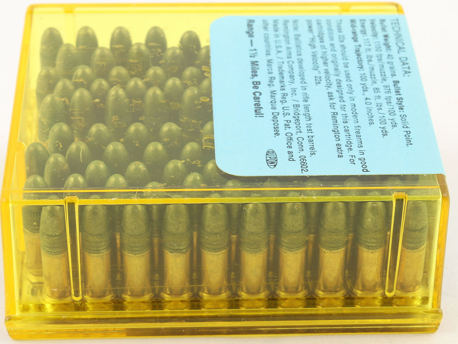 Remington, Target 22, .22 Long Rifle, Standard Velocity, RHWeb: REM-55A LR-3, FULL & SEALED, 2pc. Yellow plastic tray with green & blue sealing label, box is MINT with minty color, box is solid, label is intact, ammo appears minty. Grade: MINT - Value: 16 to 24