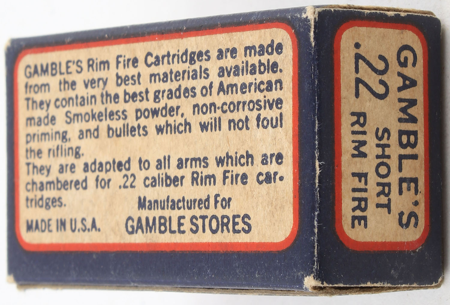 Gambles, Rim Fire Cartridges, .22 Short, RHWeb: GS-1 S-3, Partial 49rds., 1pc. Blue white & red box, box is solid with very good color, minor age soiling, very minor corner wear, edges are mostly crisp, end flaps are solid, ammo is excellent to minty. Grade: Excellent - Value: 150 to 225