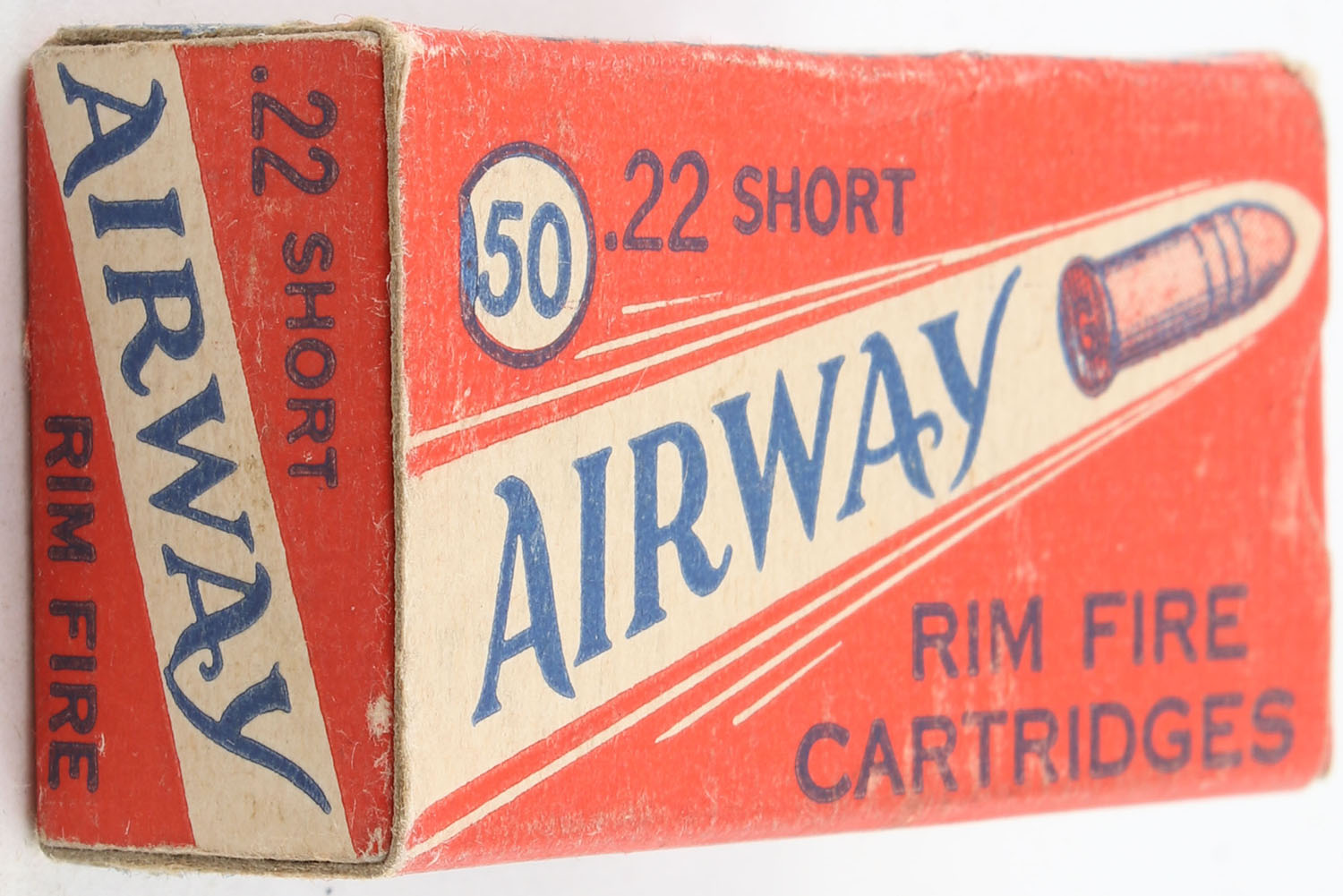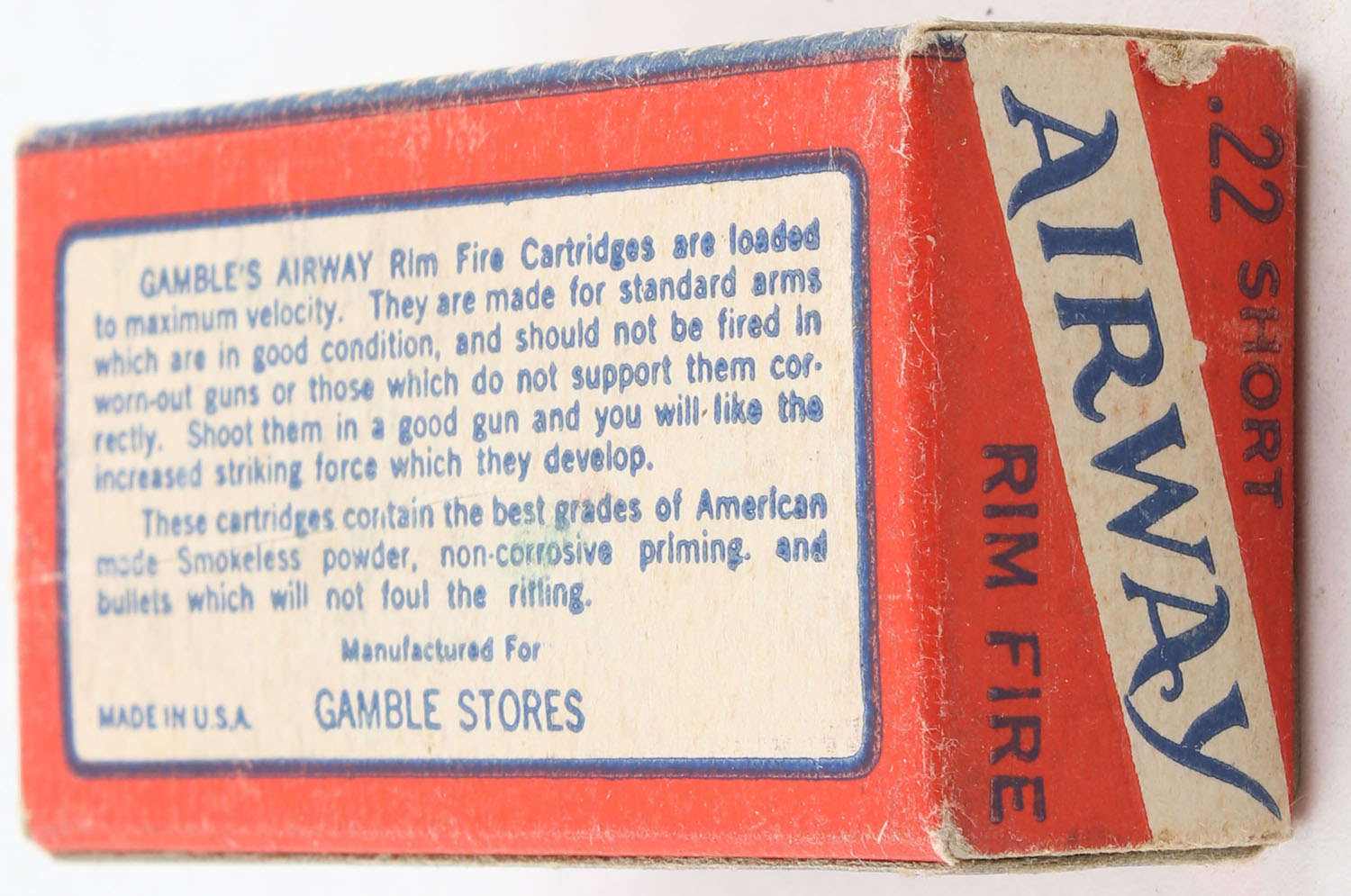 Gambles, Airway, .22 Short, RHWeb: GS-1 S-1c Full, 1pc. Red blue & white box, box is solid with excellent color, very minor age soiling & corner wear, edges are mostly crisp, end flaps are solid, ammo is excellent. Grade: Excellent - Value: 24 to 36