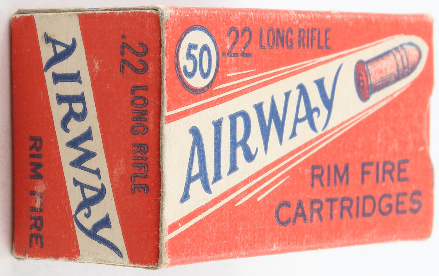 Gambles, Airway, .22 Long Rifle, RHWeb: GS-1 LR-1b, Full, 1pc. Red blue & white box, box is solid with excellent color, very minor edge & corner wear, end flaps are solid, ammo is excellent. Grade: Excellent - Value: 24 to 36
