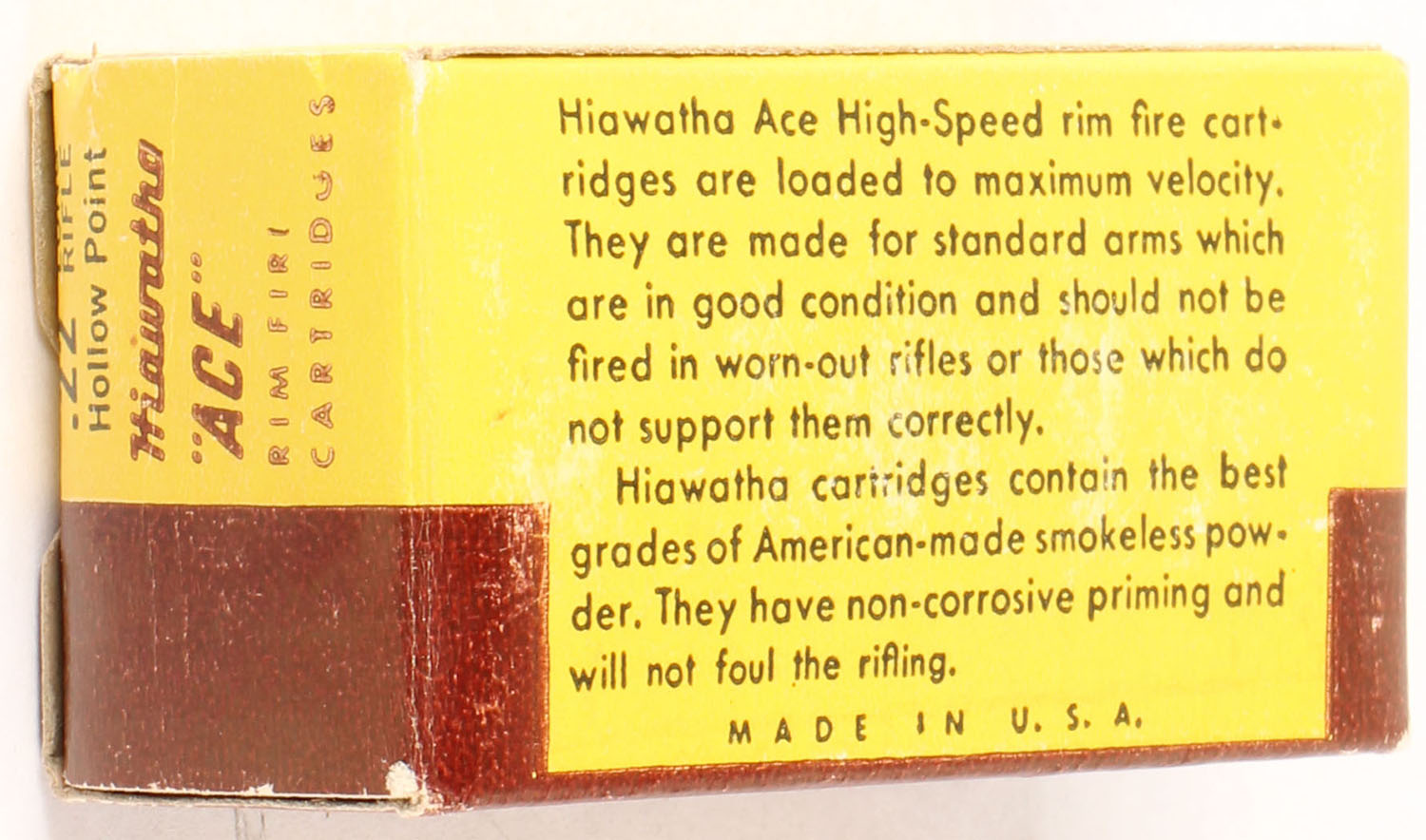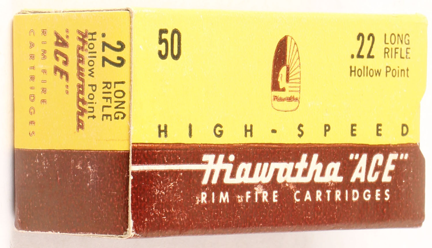 Gambles, Hiawatha ''Ace'', .22 Long Rifle Hollow Point, High-Speed, .22 Long Rifle Hollow Point, RHWeb: GS-2 LR-2, Full, 1pc. Yellow & brown box, box is solid with excellent to minty color, very minor shelf & corner wear, edges are crisp, end flaps are solid, ammo is excellent. Grade: Excellent + - Value: 30 to 45