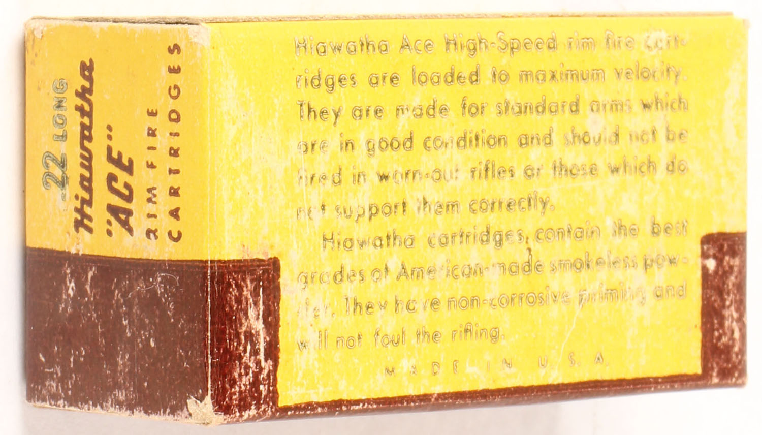 Gambles, Hiawatha ''Ace'', .22 Long, RHWeb: GS-3 L-1, Full, 1pc. Yellow & brown box with white child warning label, box is solid with excellent color, minor shelf wear, very minor age soiling & corner wear, edges are crisp, end flaps are solid, child warning label has slightly started to peel, ammo is excellent. Grade: Very Good ++ - Value: 16 to 24