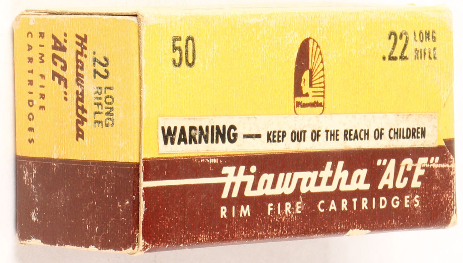 Gambles, Hiawatha ''Ace'', .22 Long Rifle, RHWeb: GS-3 LR-1, Full, 1pc. Yellow & brown box with white child warning label, box is solid with very good color, minor age soiling & corner wear, very minor shelf & edge wear, end flaps are solid, ammo is excellent. Grade: Very Good ++ - Value: 8 to 12