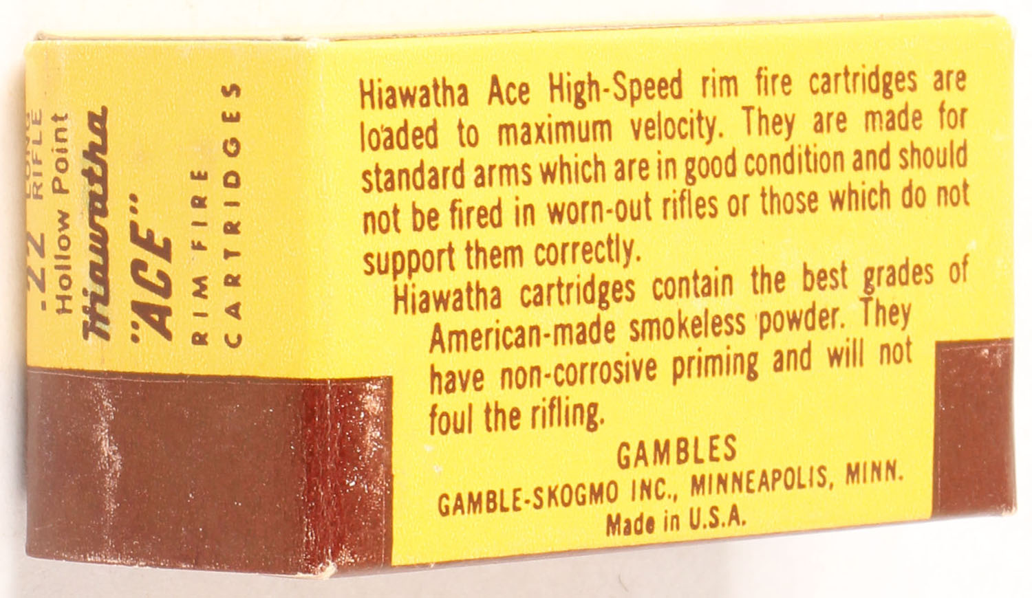 Gambles, Hiawatha ''Ace'', .22 Long Rifle Hollow Point, RHWeb: GS-4 LR-2, Full, 1pc. Yellow & brown box, box is near mint with minty color, only very minor edge wear, corners are mostly sharp, edges are crisp, end flaps are solid, ammo is excellent. Grade: Excellent ++ - Value: 24 to 36