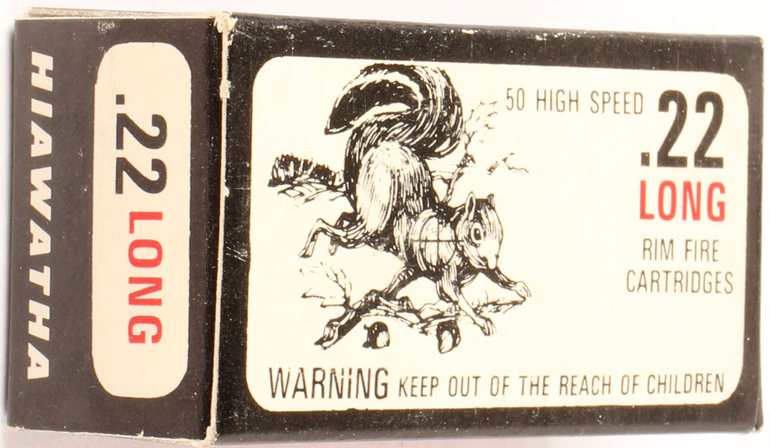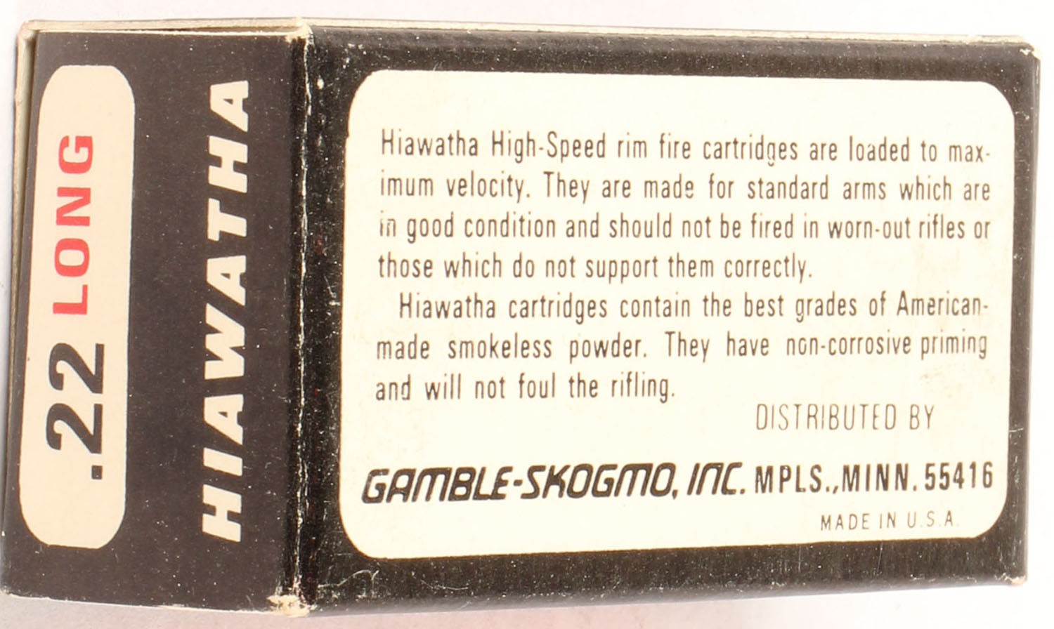 Gambles, Hiawatha, .22 Long, High Speed, RHWeb: GS-5 L-1, Full, 1pc. White black & red box, box is near mint with minty color, only very minor corner wear, edges are crisp, end flaps are solid, ammo is minty. Grade: Excellent ++ - Value: 50 to 75