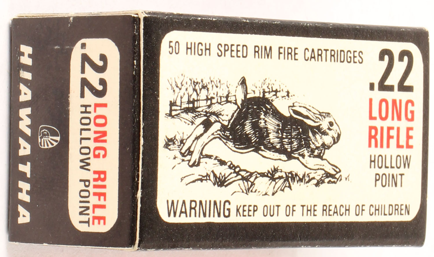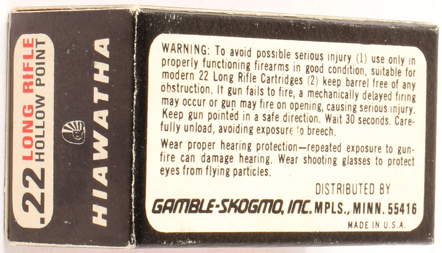 Gambles, Hiawatha, .22 Long Rifle Hollow Point, High Speed, RHWeb: GS-5 LR-2c, Full, 1pc. White black & red box, box is near mint with minty color, only very minor corner wear, edges are crisp, end flaps are solid, ammo is mint. Grade: Excellent ++ - Value: 60 to 90