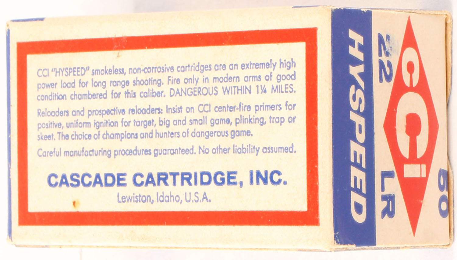 CCi, Hyspeed, .22 Long Rifle, RHWeb: CCI-1 LR-1, Full, 1pc. White red & blue box, box is near mint with minty color, only very minor corner wear, edges are crisp, end flaps are solid, ammo is minty. Grade: Excellent ++ - Value: 4 to 10