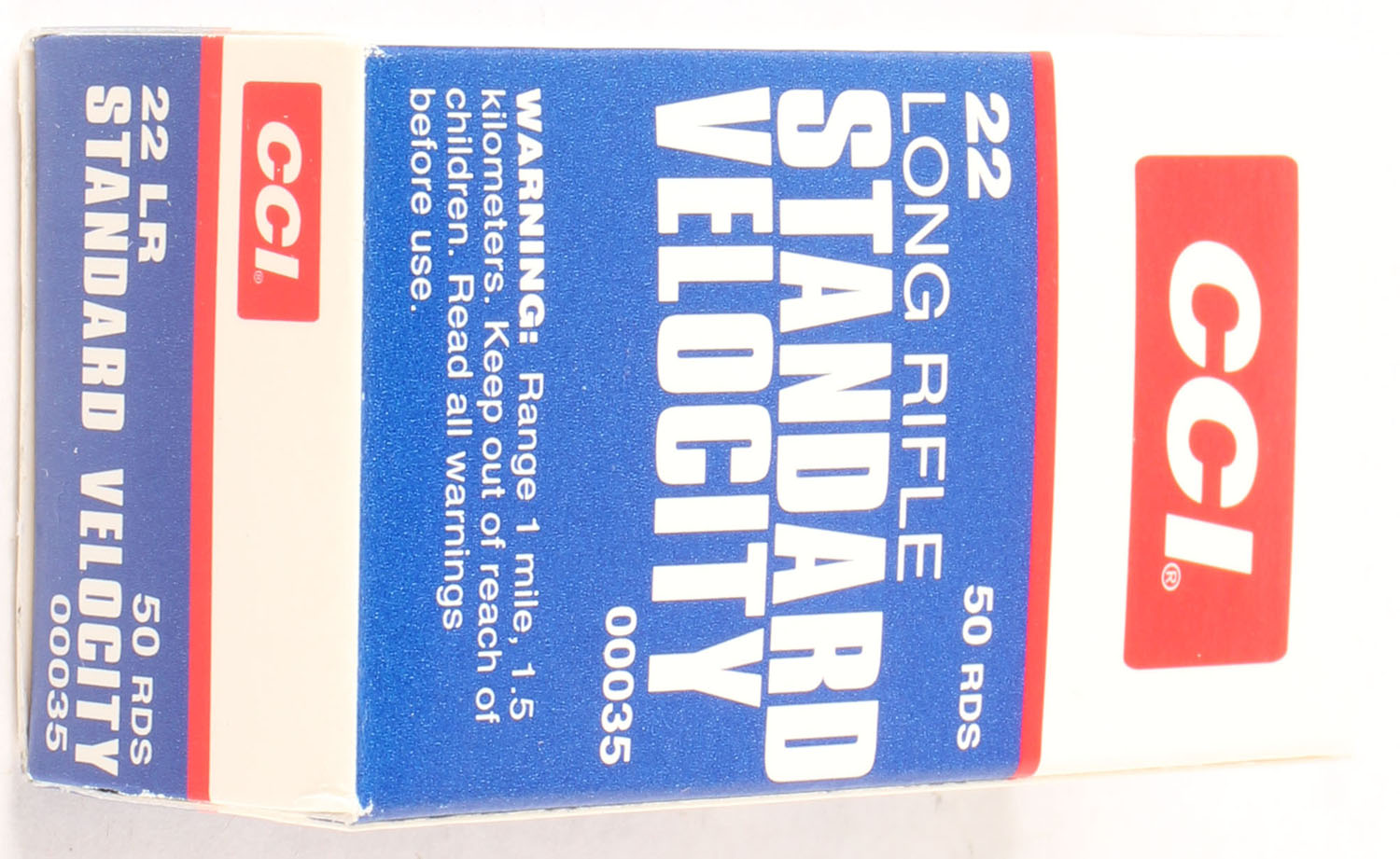 CCi, Standard Velocity, .22 Long Rifle, RHWeb: CCI-8 LR-15a, Full, 1pc. Blue white & red box, box is MINT with minty color, corners are sharp, edges are crisp, end flaps are solid, ammo is mint. Grade: MINT - Value: 12 to 18