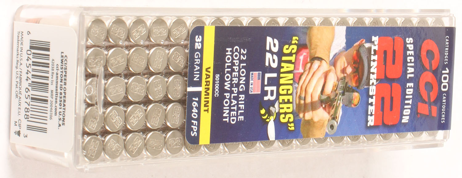CCi, 22 Plinkster Special Edition ''Stangers'', .22 Long Rifle Stinger, FULL & SEALED, 2pc. Clear plastic tray with multi-colored sealing label, box and label are MINT with mint color, ammo appears mint. Grade: MINT - Value: 12 to 16