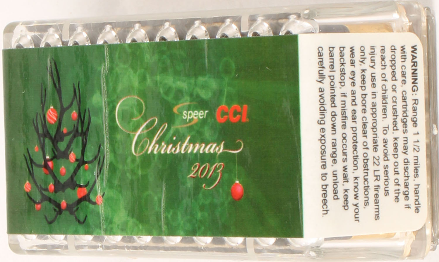 CCi, Merry Christmas 2013, .22 LR Suppressor 45gr HP, FULL & SEALED, 2pc. Clear plastic tray with label featuring elk antlers with red Christmas ornaments hanging, plastic tray is clean & clear, label is intact with minty color. Grade: MINT - Value: 30 to 45