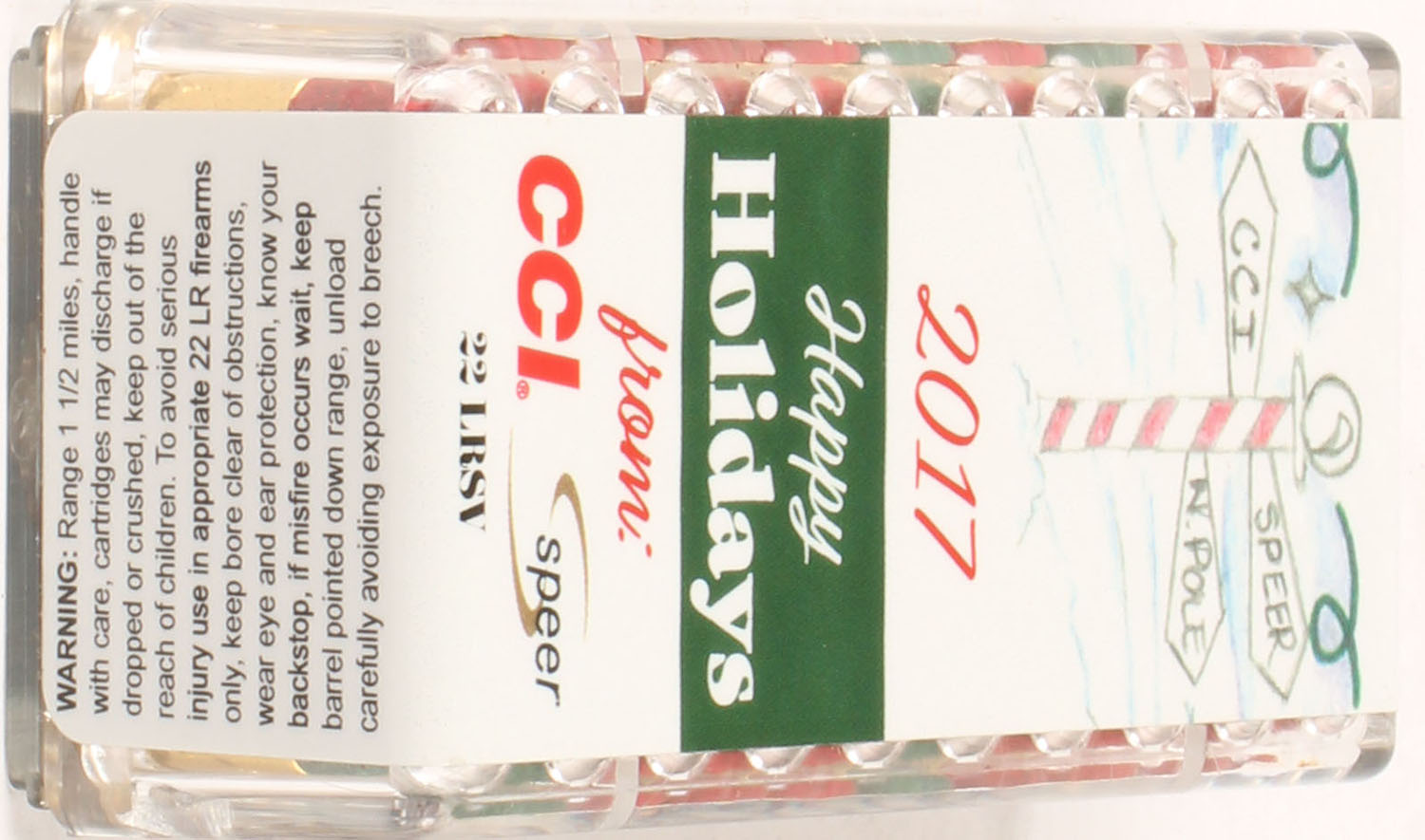 CCi, Merry Christmas 2017, .22 Long Rifle, Standard Velocity, FULL & SEALED, 2pc. Clear plastic tray with label featuring a festive Christmas scene, tray is clean & clear, label is intact with minty color. Grade: MINT - Value: 50 to 75