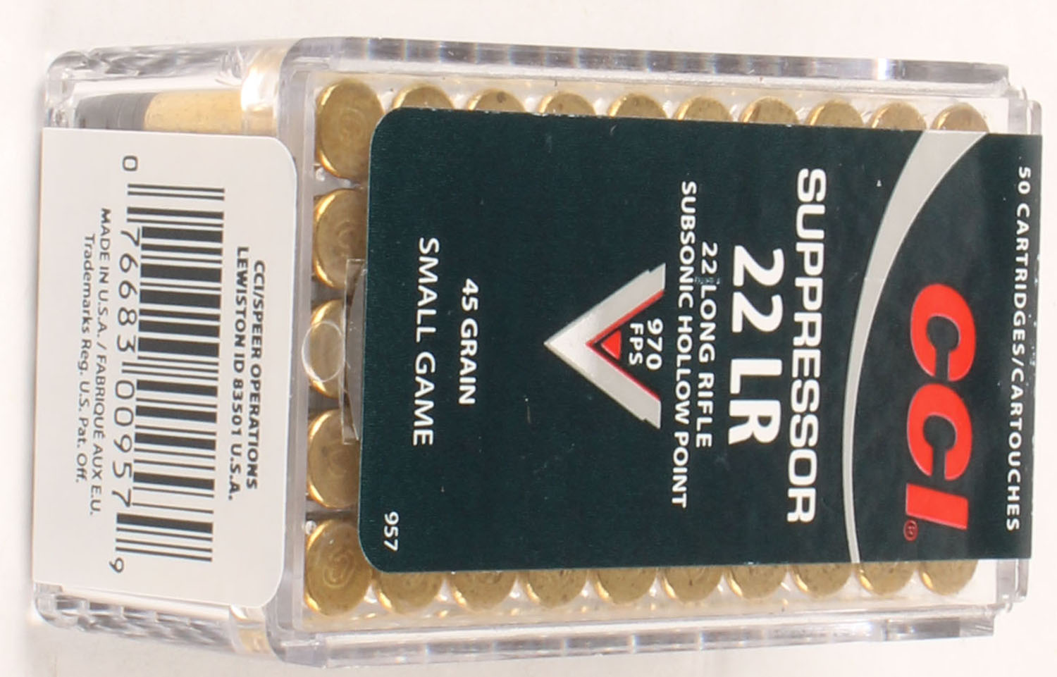 CCi, Suppressor, .22 Long Rifle, 45 Grain Subsonic Hollow Point, 970 FPS, FULL & SEALED, 2pc. Clear plastic tray with blue sealing labels, box is MINT, label is intact with minty color, ammo appears minty. Grade: MINT - Value: 12 to 18