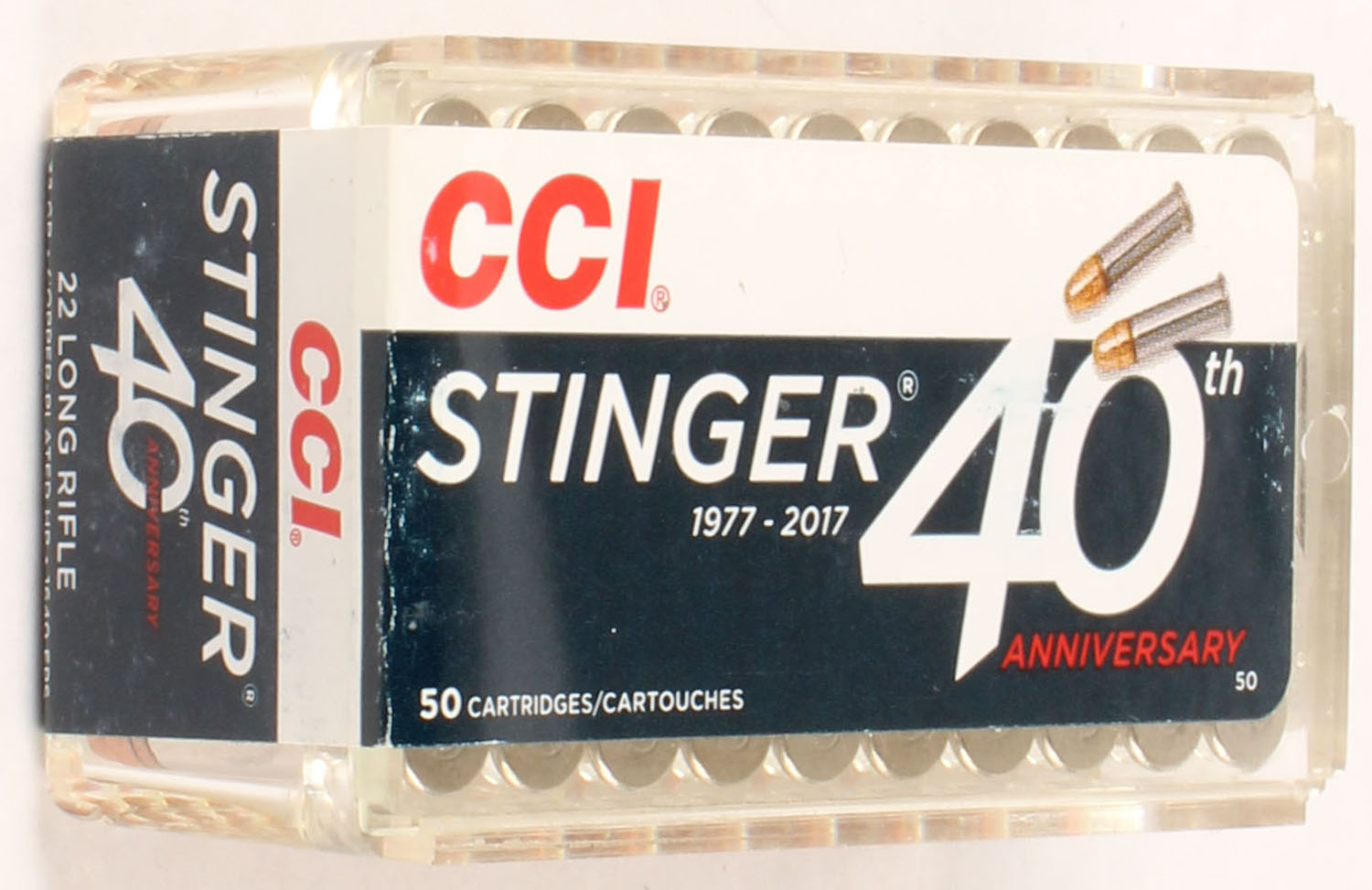 CCi, 40th Anniversary (1977-2017) Edition Stinger, .22 Long Rifle Stinger, FULL & SEALED, 2pc. Clear plastic tray with blue & white sealing label, box is MINT with mint color, label is mint, ammo appears mint. Grade: MINT - Value: 24 to 36