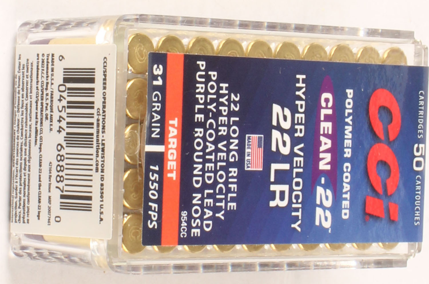 CCi, Polymer Coated CLEAN, Hyper Velocity, .22 Long Rifle Purple round nose, FULL, 1pc. box is MINT with minty color, ammo appears minty. Grade: MINT - Value: 8 to 12