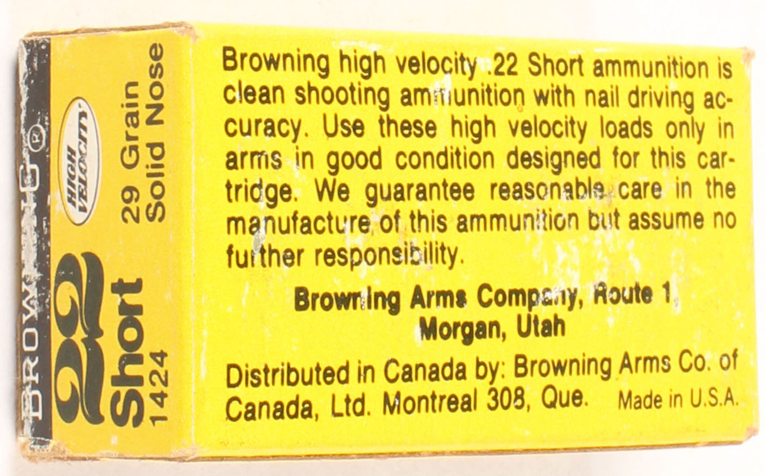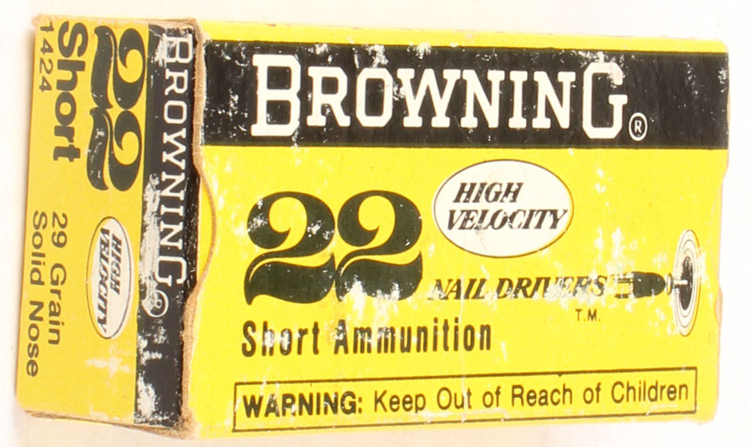 Browning, Nail Drivers, .22 Short, High Velocity, RHWeb: BROWN-1 S-1, Full, 1pc. Yellow black & white box, box is solid with excellent color, some shelf wear, minor corner wear, edges are mostly crisp, end flaps are solid, ammo is minty. Grade: Very Good ++ - Value: 60 to 90