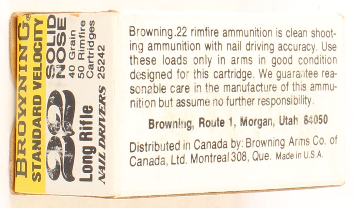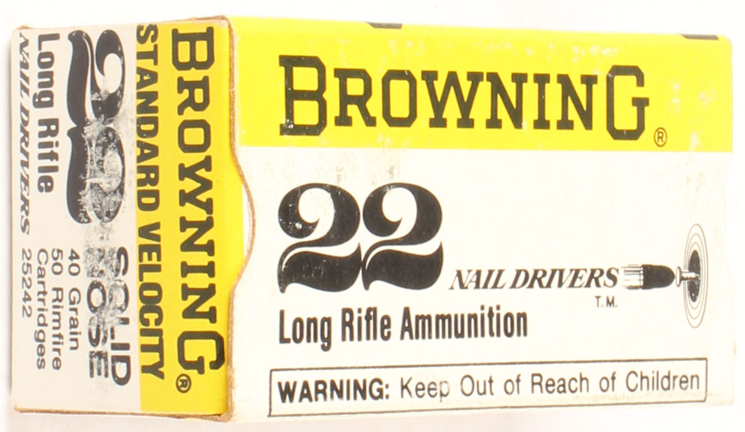 Browning, Nail Drivers, .22 Long Rifle, Standard Velocity, 40 Grain Solid Nose, RHWeb: BROWN-1 LR-3, Full, 1pc. White black & yellow box, box is solid with excellent to minty color, minor shelf wear, corners are mostly sharp, edges are crisp, end flaps are solid, ammo is minty. Grade: Excellent + - Value: 60 to 90