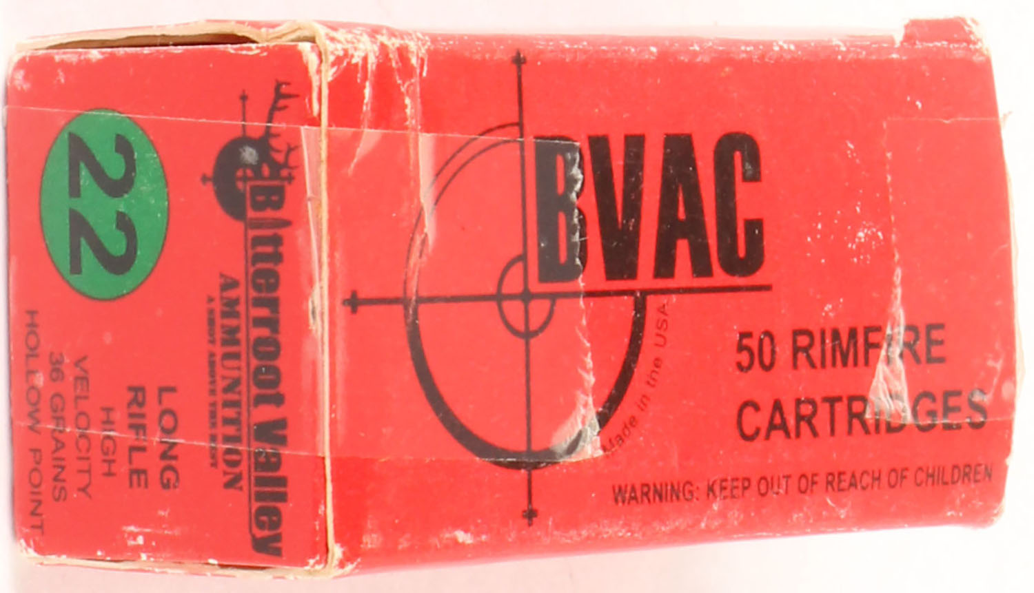 Bitterroot Valley, .22 Long Rifle Hollow Point, High Velocity, RHWeb: BVAC-1 LR-1, Full, 1pc. Red & black box, box is solid with excellent color, tape on both end flaps shelf wear, minor corner wear, edges are mostly crisp, end flaps are solid, ammo is mint. Grade: Very Good - Value: 10 to 15
