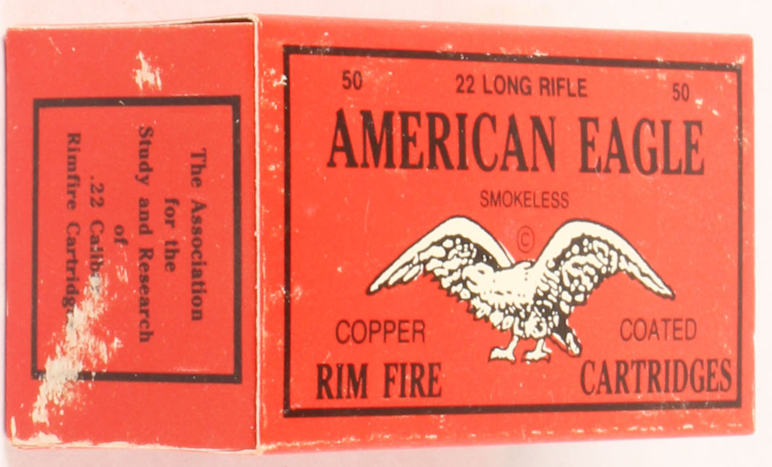 SECCA, Federal American Eagle, .22 Long Rifle, RHWeb: SECCA-2 1992, Full, 1pc. Red black & white box, box is solid with excellent to minty color, some shelf wear, corners are mostly sharp, edges are crisp, end flaps are solid, ammo is minty. Grade: Excellent - Value: 6 to 10