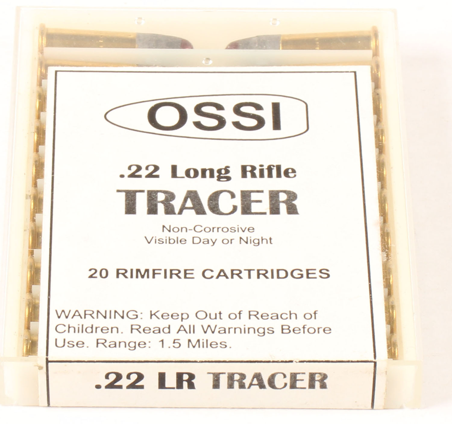 OSSI, Tracer, .22 Long Rifle, High Velocity, Non-Corrosive, RHWeb: OSSI-1 LR-2, FULL & SEALED, 2pc. White plastic tray with white sealing label, box is MINT with minty colors, label is intact, ammo appears mint. Grade: MINT - Value: 16 to 24