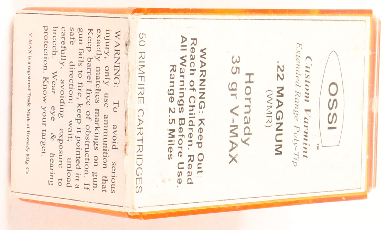 OSSI, Custom Varmint, .22 Magnum, 35 Grain Hornady V-Max Moly-Coat, RHWeb: OSS1-1 WMR-1, Full, 2pc. Amber plastic tray with white sealing label, box is solid with excellent color, very minor age soiling, label is intact, ammo is minty. Grade: Excellent ++ - Value: 10 to 15