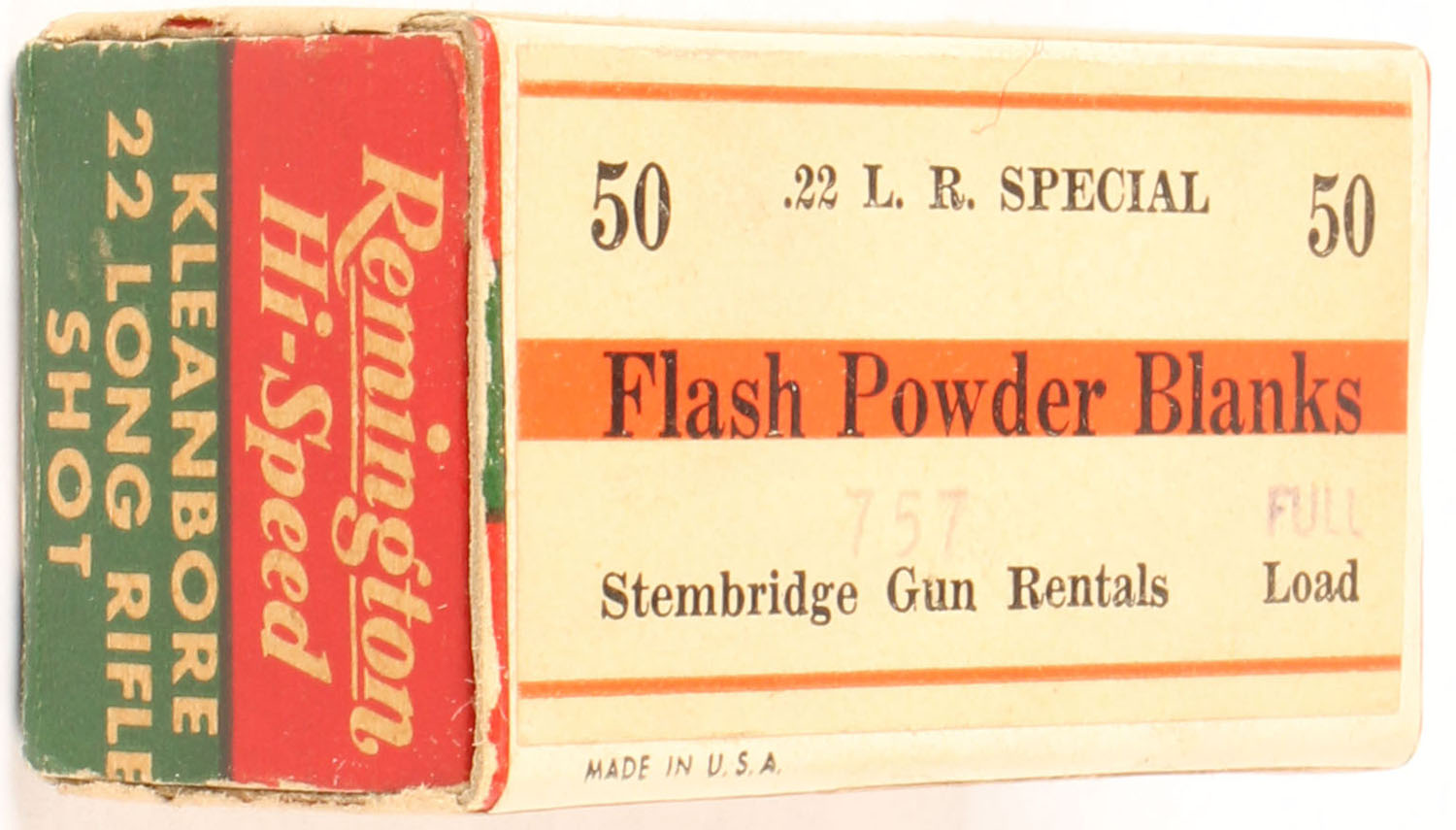 Stembridge Gun Rentals, Flash Powder Blanks, .22 Long Rifle Special, Full Load, RHWeb: MOVIE-1 LR-2, Partial 49rds., 1pc. Buff box with white & orange label, box is solid with very good to excellent color, minor age soiling, very minor corner wear, edges are mostly crisp, end flaps are solid, ammo is excellent. Grade: Excellent - Value: 40 to 60