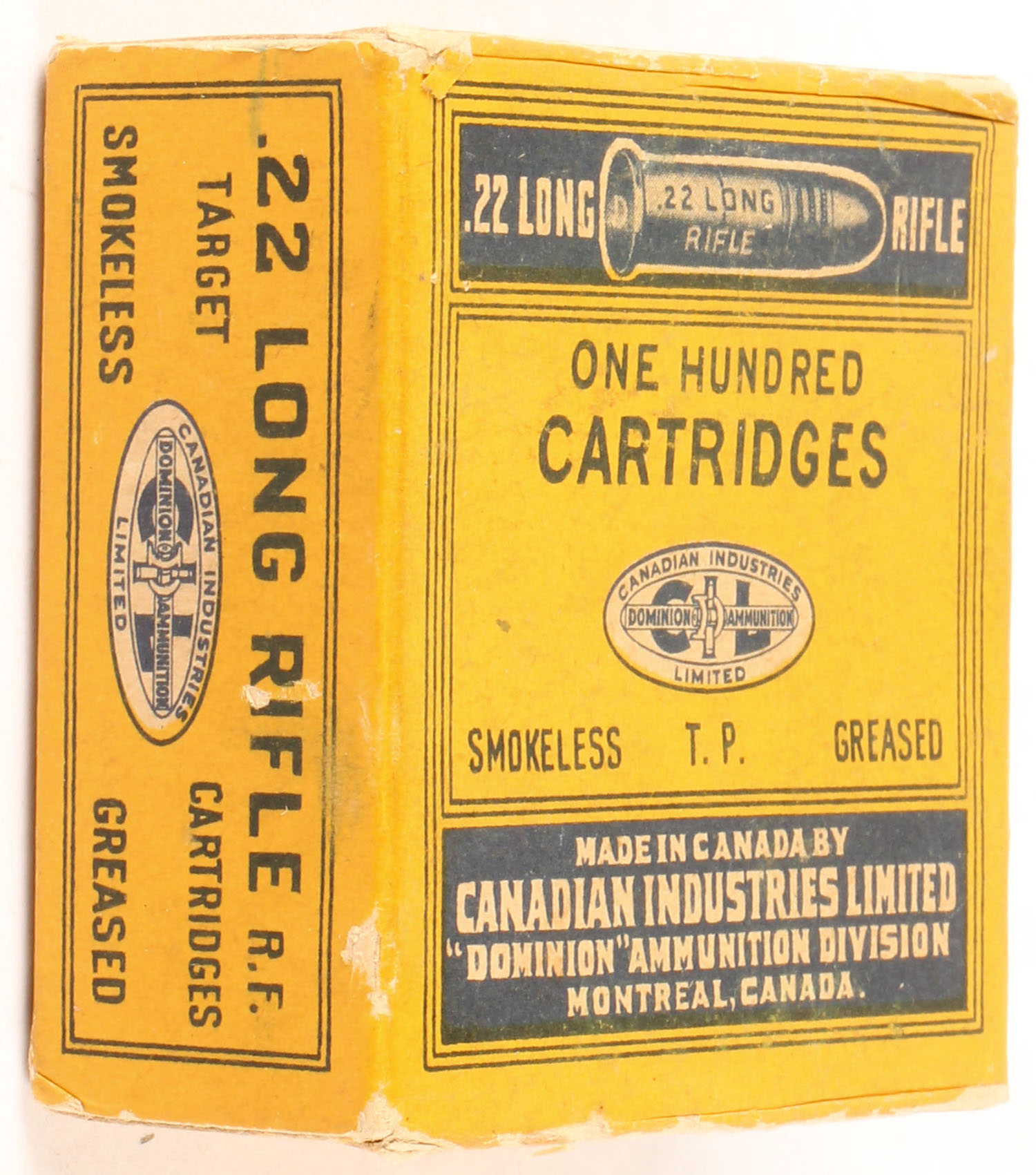 C.I.L., Target Cartridges, .22 Long Rifle, Smokeless Greased, RHWeb: (Canada) CIL-2 LR-9d, FULL & SEALED, 2pc. Yellow & blue box, box is solid with excellent color, very minor age soiling, minor edge & corner wear. Grade: Excellent - Value: 24 to 36