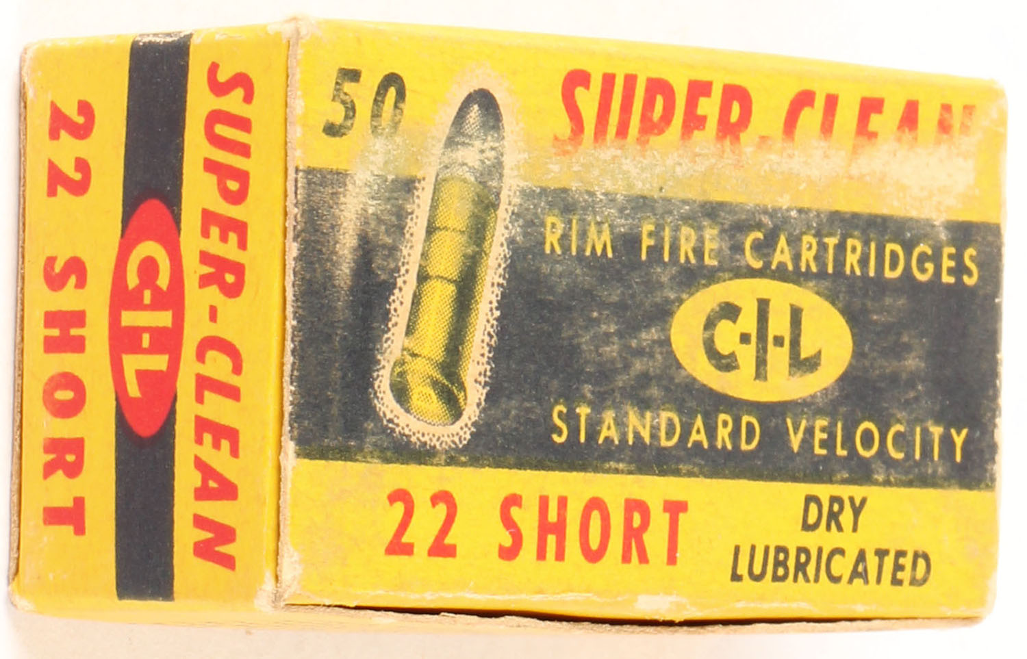 C.I.L., Super-Clean, .22 Short, Standard Velocity, RHWeb: CIL-4 S-5, Full, 1pc. Yellow & blue box, box is solid with very good color, shelf wear, corners are mostly sharp, edges are crisp, top flap is solid, ammo is excellent. Grade: Very Good - Value: 10 to 15