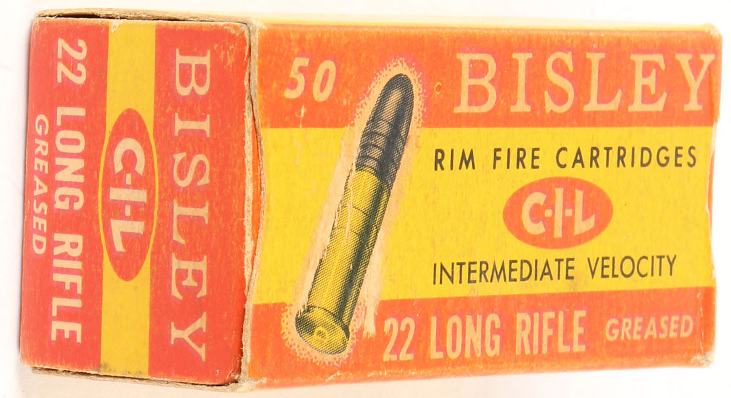 C.I.L., Bisley, .22 Long Rifle, Intermediate Velocity, Greased, RHWeb: CIL-4 LR-7 Full, 1pc. Yellow & red box, box is solid with good to very good color, some age soiling & color fading, minor corner wear, edges are mostly crisp, end flaps are solid, ammo is excellent. Grade: Very Good - Value: 20 to 30