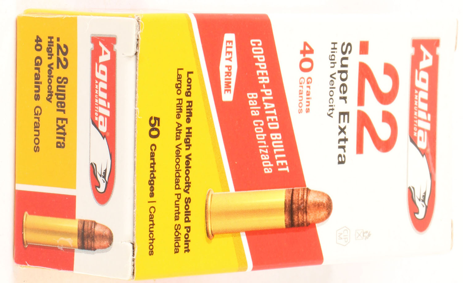 Aguila, Super Extra, .22 Long Rifle, High Velocity, 40 Grain Copper-Plated Bullet, Full, 1pc. White yellow & red box, box is MINT with minty color, ammo is mint. Grade: MINT - Value: 6 to 10