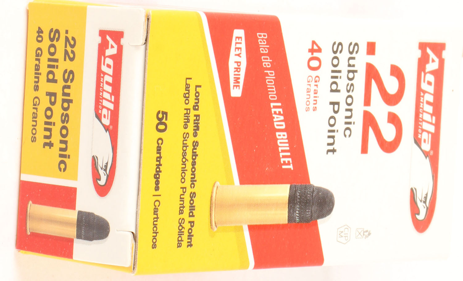 Aguila, Subsonic Solid Point, .22 Long Rifle, 40 Grain Lead Bullet, Full, 1pc. White yellow & red box, box is MINT with minty color, corner is mint. Grade: MINT - Value: 6 to 10