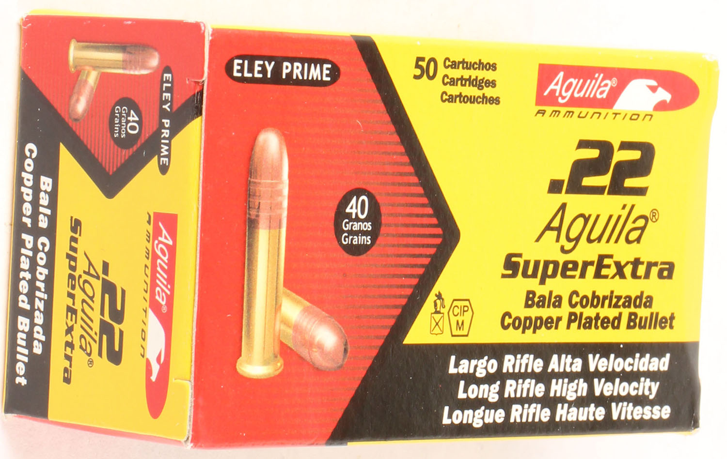 Aguila, SuperExtra, .22 Long Rifle, 40 Grain Copper Plated Bullet, Full, 1pc. Yellow & red box, box is MINT with minty color, ammo is mint. Grade: MINT - Value: 6 to 10