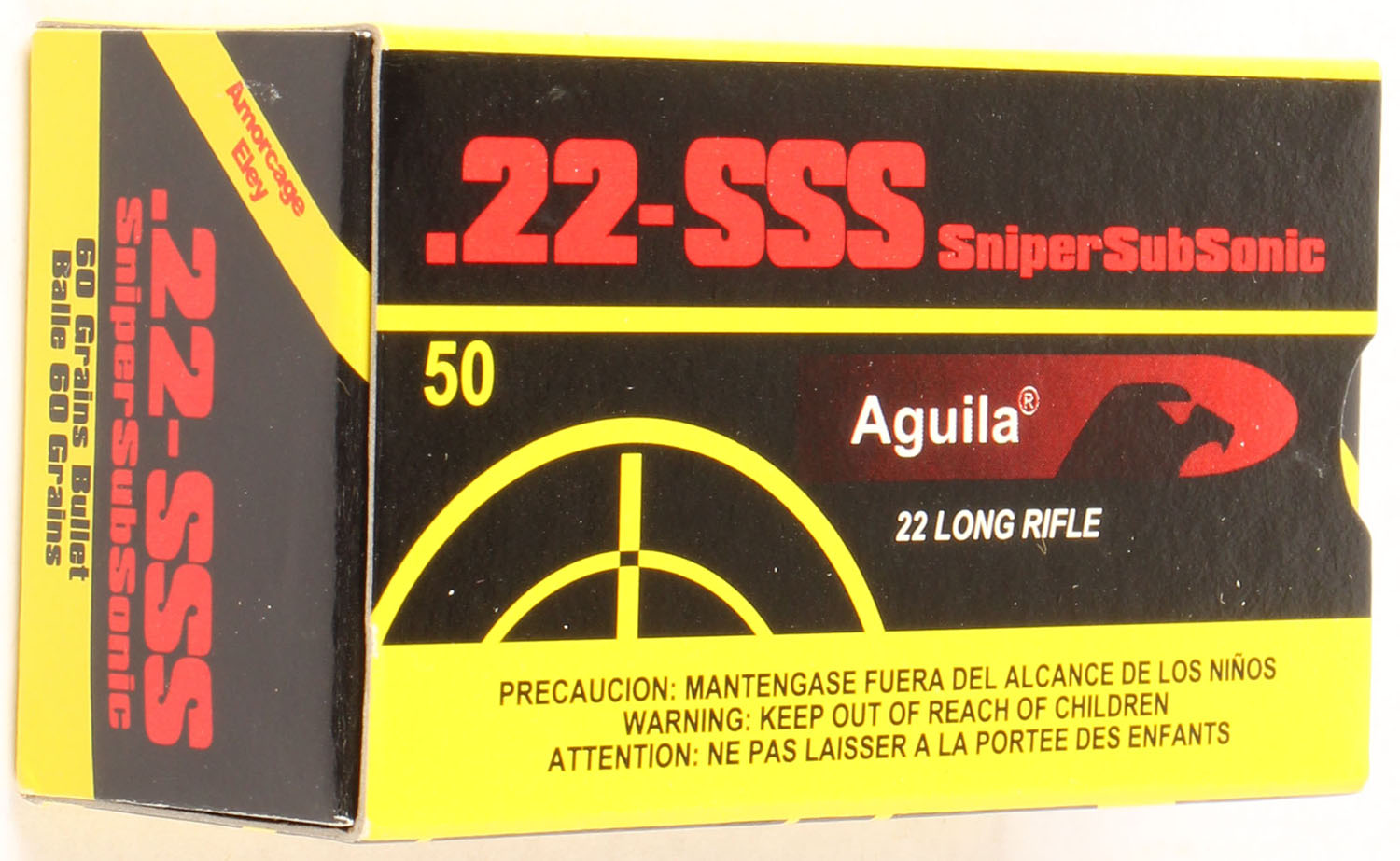 Aguila, SniperSubSonic, .22 Long Rifle, 60 Grain Bullet, Full, 1pc. Black yellow & red box, box is MINT with mint color, corners are sharp, edges are crisp, end flaps are solid, ammo is mint. Grade: MINT - Value: 8 to 12