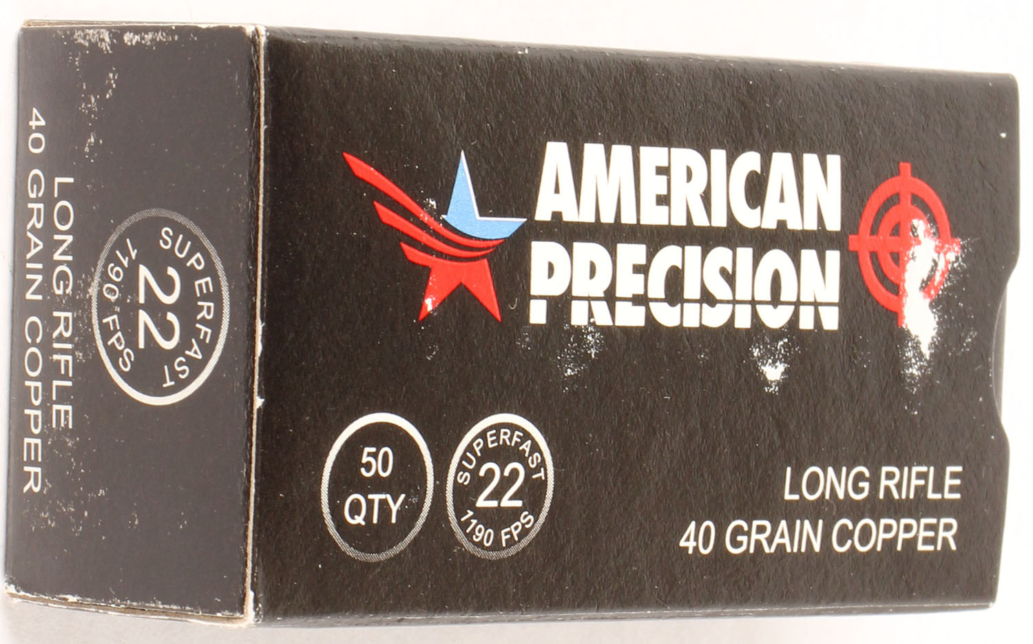 American Precision, Superfast, .22 Long Rifle, 40 Grain Copper, RHWeb: (Mexico) MEX-CCI-7 LR-2, Full, 1pc. Black box with white red & blue printing, box is MINT with minty color, corners are sharp, edges are crisp, end flaps are solid, ammo is minty. Grade: MINT - Value: 10 to 15