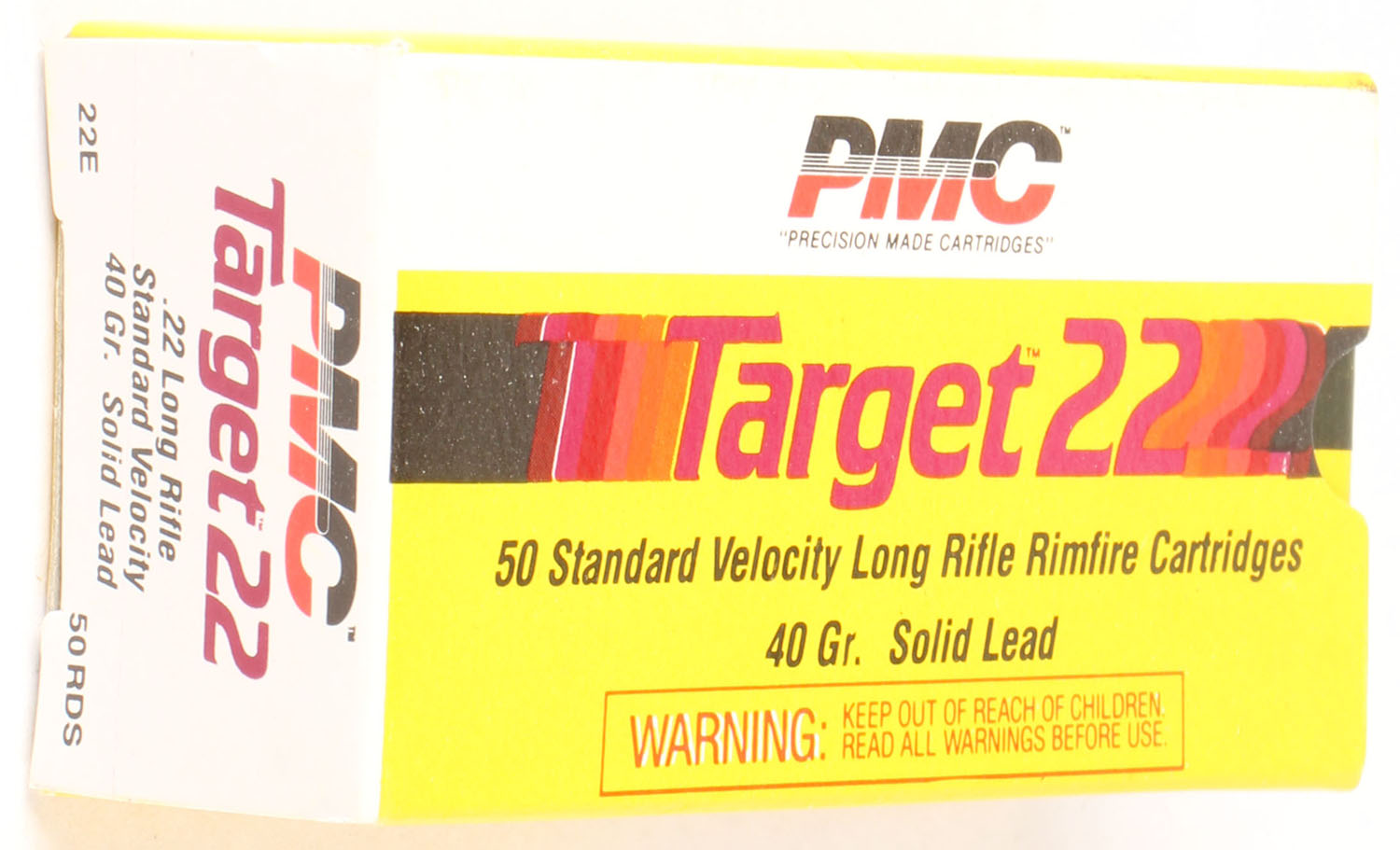 PMC, Target 22, .22 Long Rifle, 40 Gr. Solid Lead, RHWeb: PMC-2 LR-6, Full, 1pc. Yellow & white box, box is MINT with minty color, corners are sharp, edges are crisp, end flaps are solid, ammo is minty. Grade: MINT - Value: 4 to 10