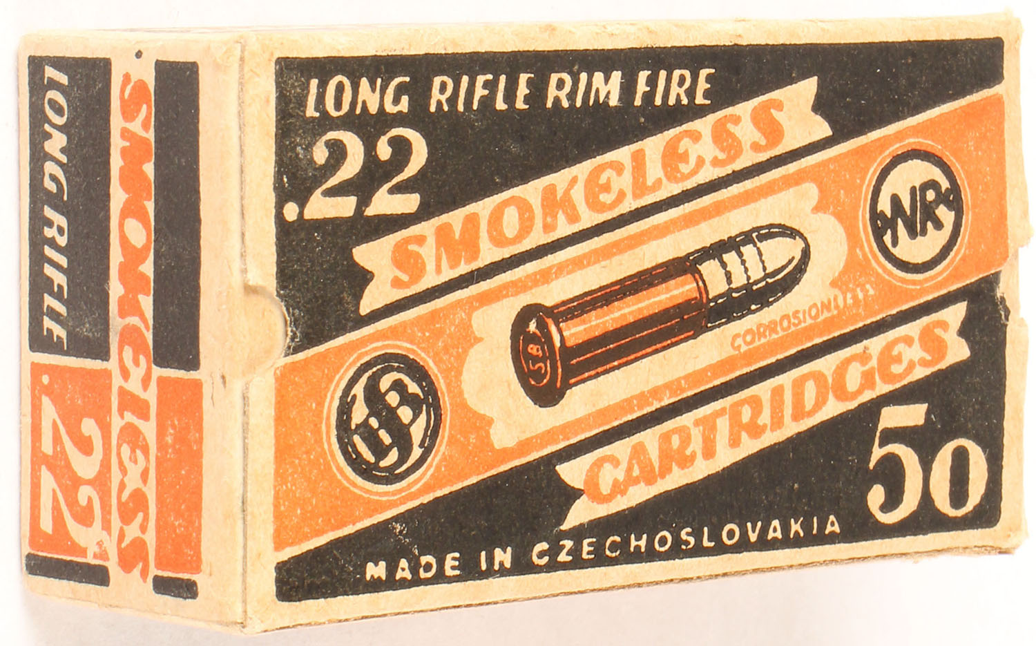 Sellier & Bellot, Smokeless Cartridges, .22 Long Rifle, RHWeb: (Czechoslovakia) SB-2.5 LR-1, Full, 1pc. Black orange & buff box, box is solid with very good color, minor age soiling, very minor edge & corner wear, end flaps are solid, ammo is excellent. Grade: Very Good ++ - Value: 20 to 40