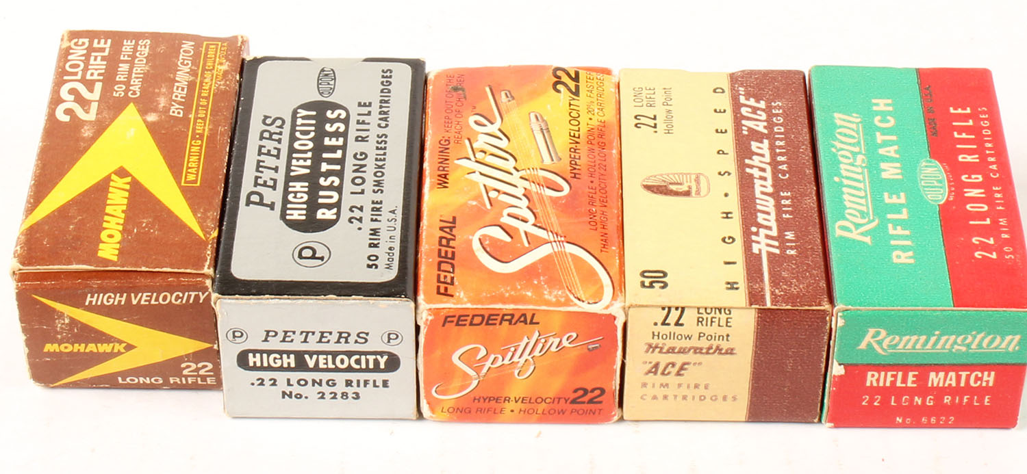 Mixed Mfg., Lot of (5) boxes, (3) boxes appear full, Mohawk box is full of mixed ammo, Spitfire box is partial. Grade: Excellent - Value: 16 to 24