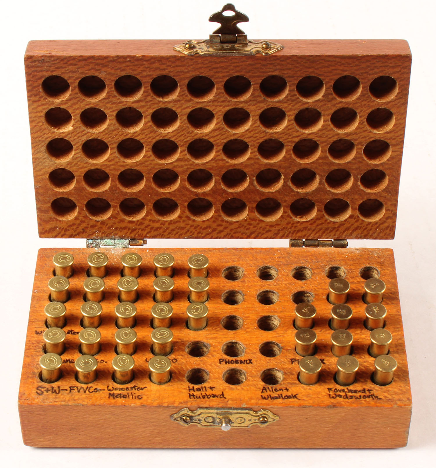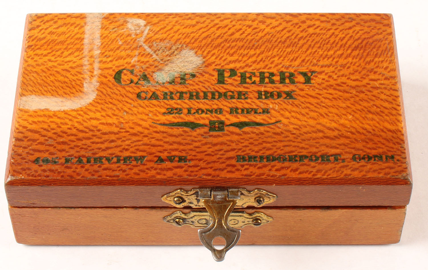 Camp Perry Cartridge Box, .22 Long Rifle, wood ammo box with brass hinges & latch, box is solid with excellent color, some water staining to top, hinges & latch are excellent, inside has been written on. Grade: Very Good - Value: 50 to 75