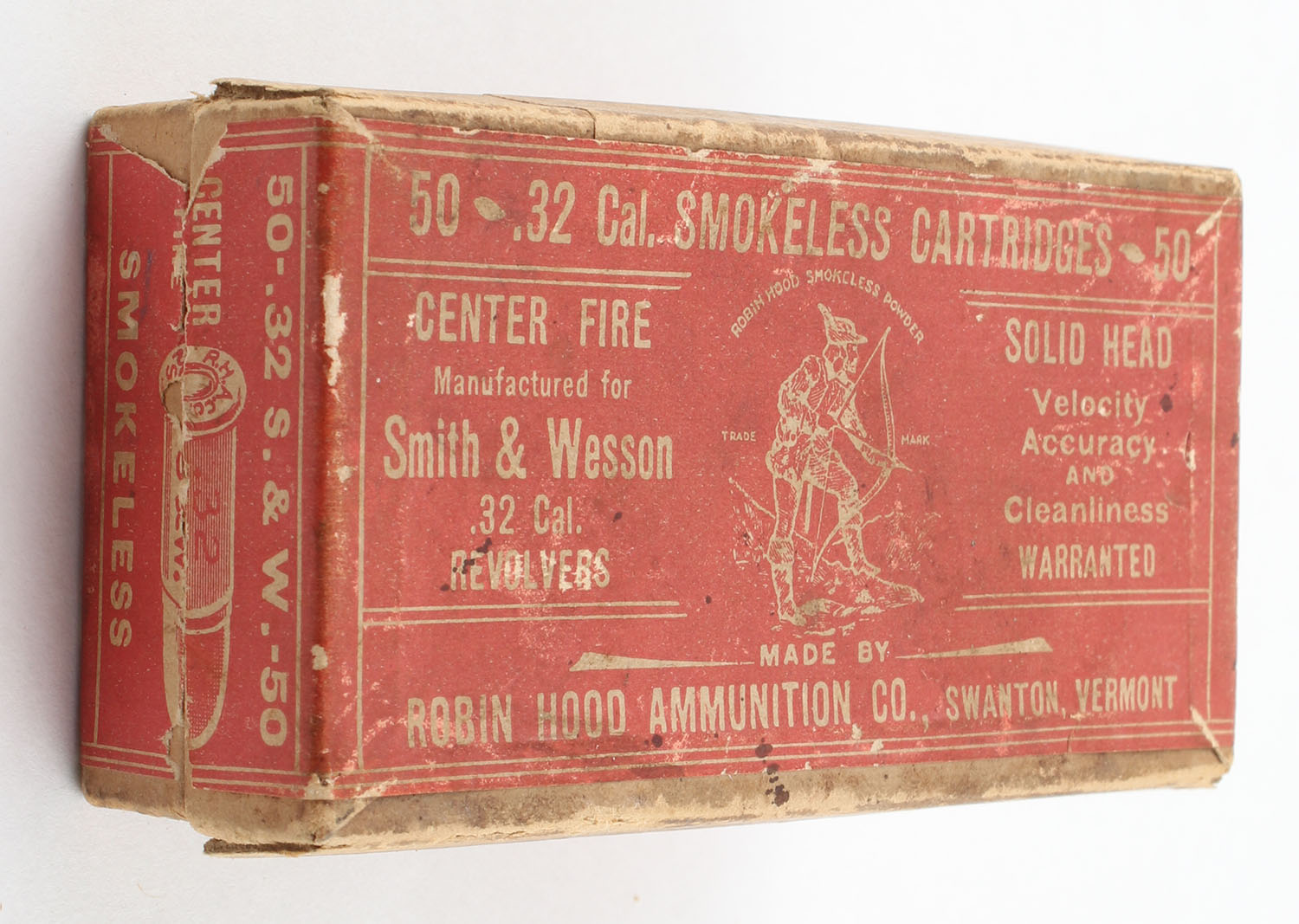 ROBIN HOOD, .32 Cal. Smith & Wesson, Solid Head Cartridges, 2pc., Partial 3rds., Central Fire, Smokeless Powder, buff box with red & white label, box has light age soiling & scuffing, box is solid on bottom & has seam splits to top, ammo is very good. Grade: Very Good + - Value: 100 to 300