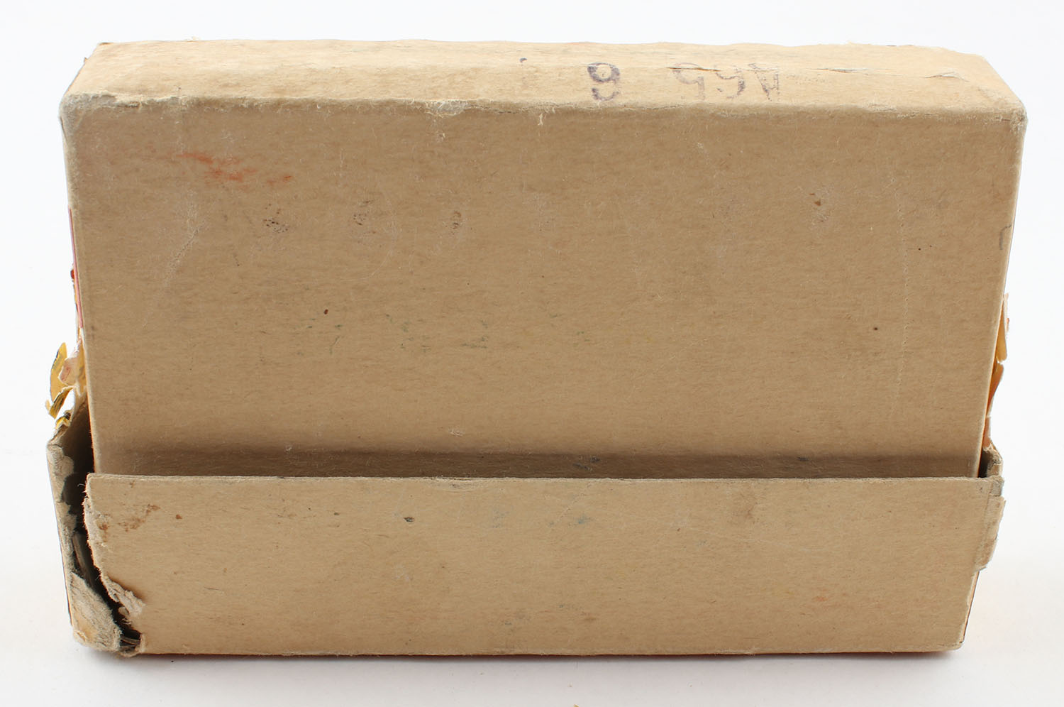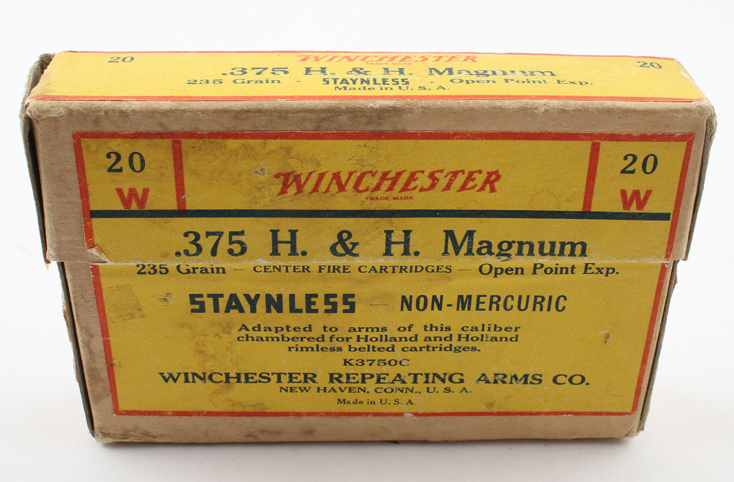 Winchester, Staynless - Non-Mercuric, .375 H&H Magnum, 235 Grain Open Point Exp., Full & Half Sealed with Insert, 2pc. Buff box with yellow black & red labels, box is solid with very good color, box has light age soiling & scuffing, top has two seam splits, ammo is excellent. Grade: Very Good ++ - Value: 40 to 120