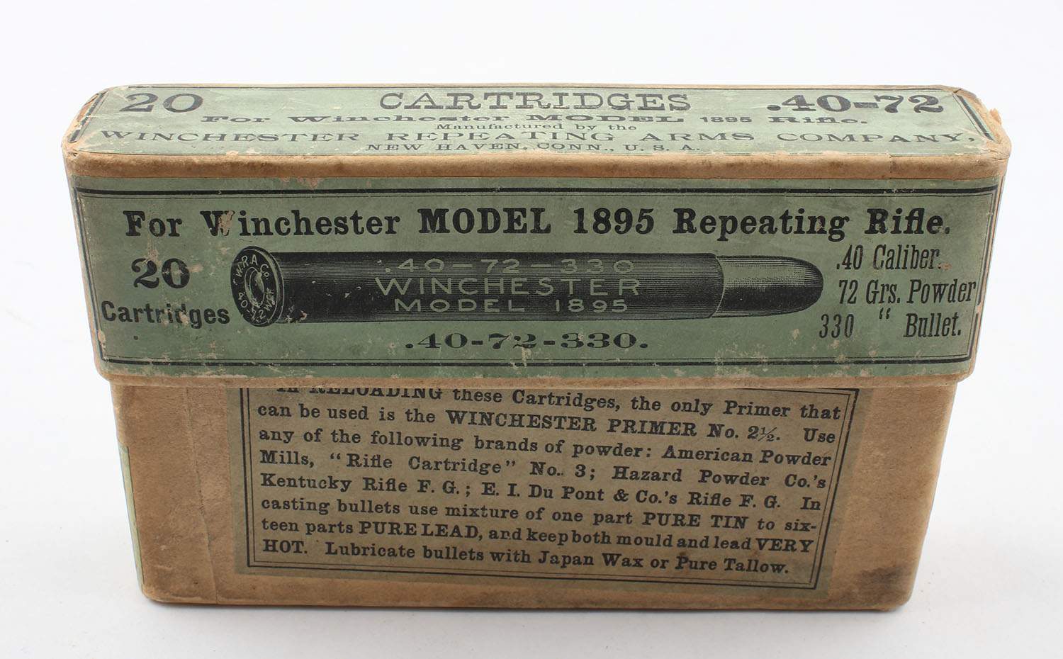 Winchester, Cartridges for Winchester Model 1895, .40-72-330 Winchester, Full, 2pc. Buff box with green label, box is very solid with excellent color, box has shelf wear with some rub marks, labels are intact, ammo is excellent. Grade: Excellent + - Value: 100 to 300